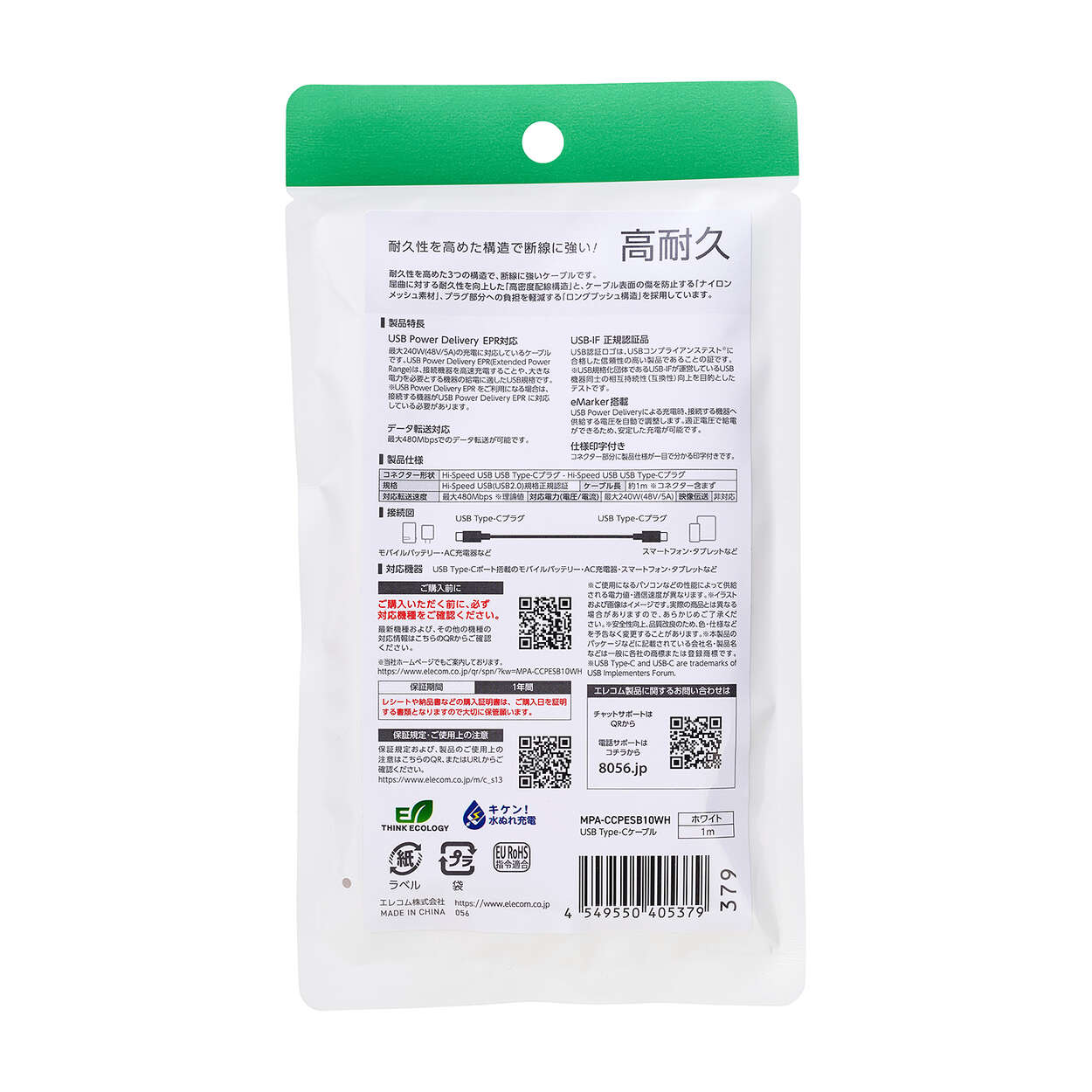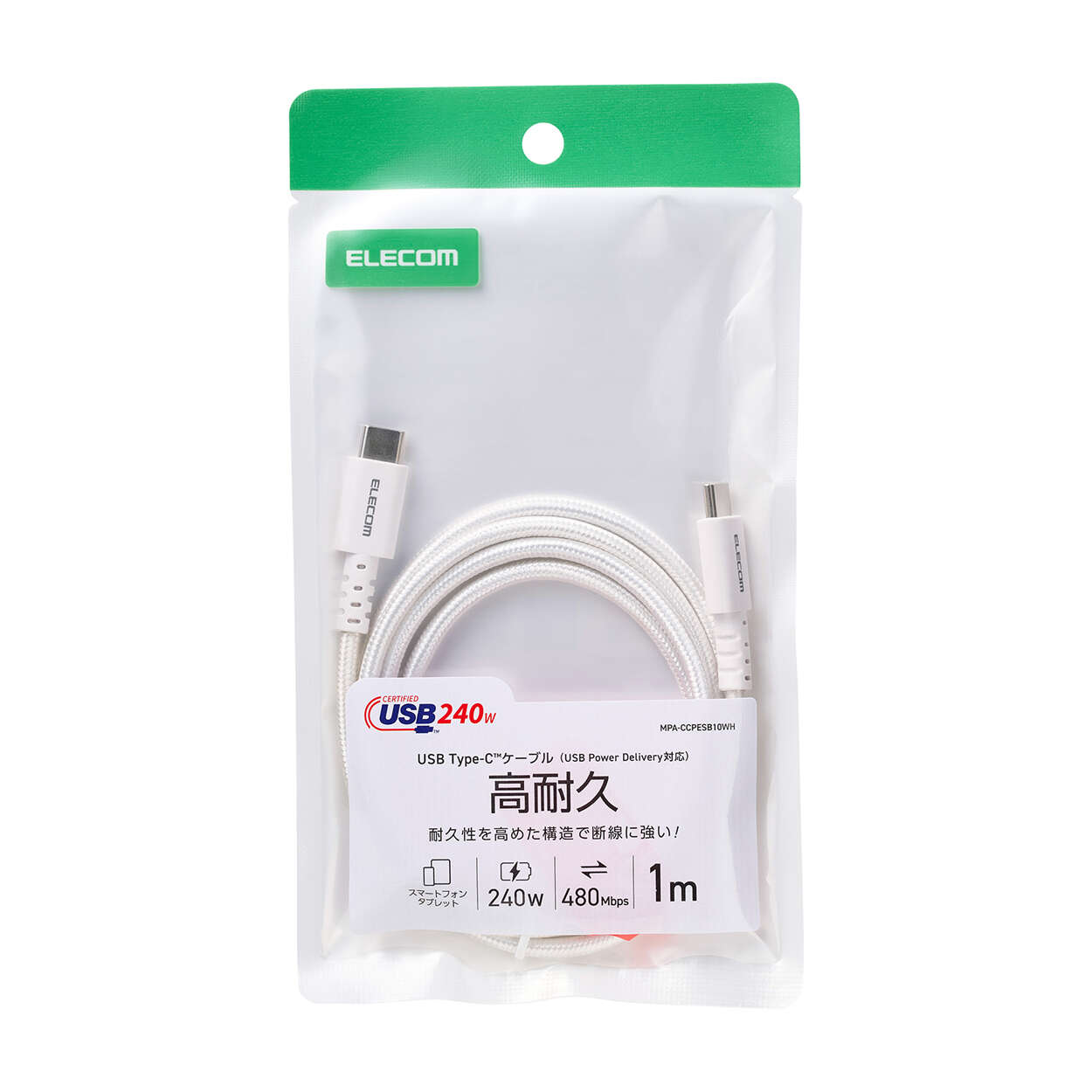 ケーブル断線のストレスから解放!断線しやすいブッシュ部を強化してナイロンメッシュケーブルを使用した、日常使いの屈曲にも耐える高耐久モデルのUSB Type-C(TM)ケーブルです。USB Power Delivery EPR(最大240W)に対応し、スマートフォン・タブレット、パソコンなど消費電力が高い機器の高速充電が可能。USB Type-Cポートを搭載した機器同士を接続できるUSB2.0正規認証品ケーブルです。