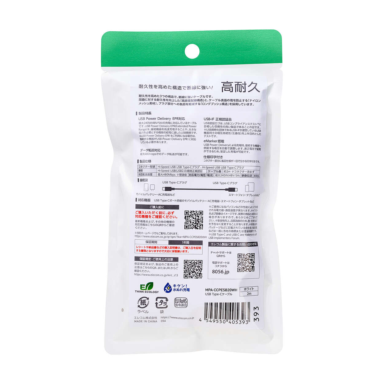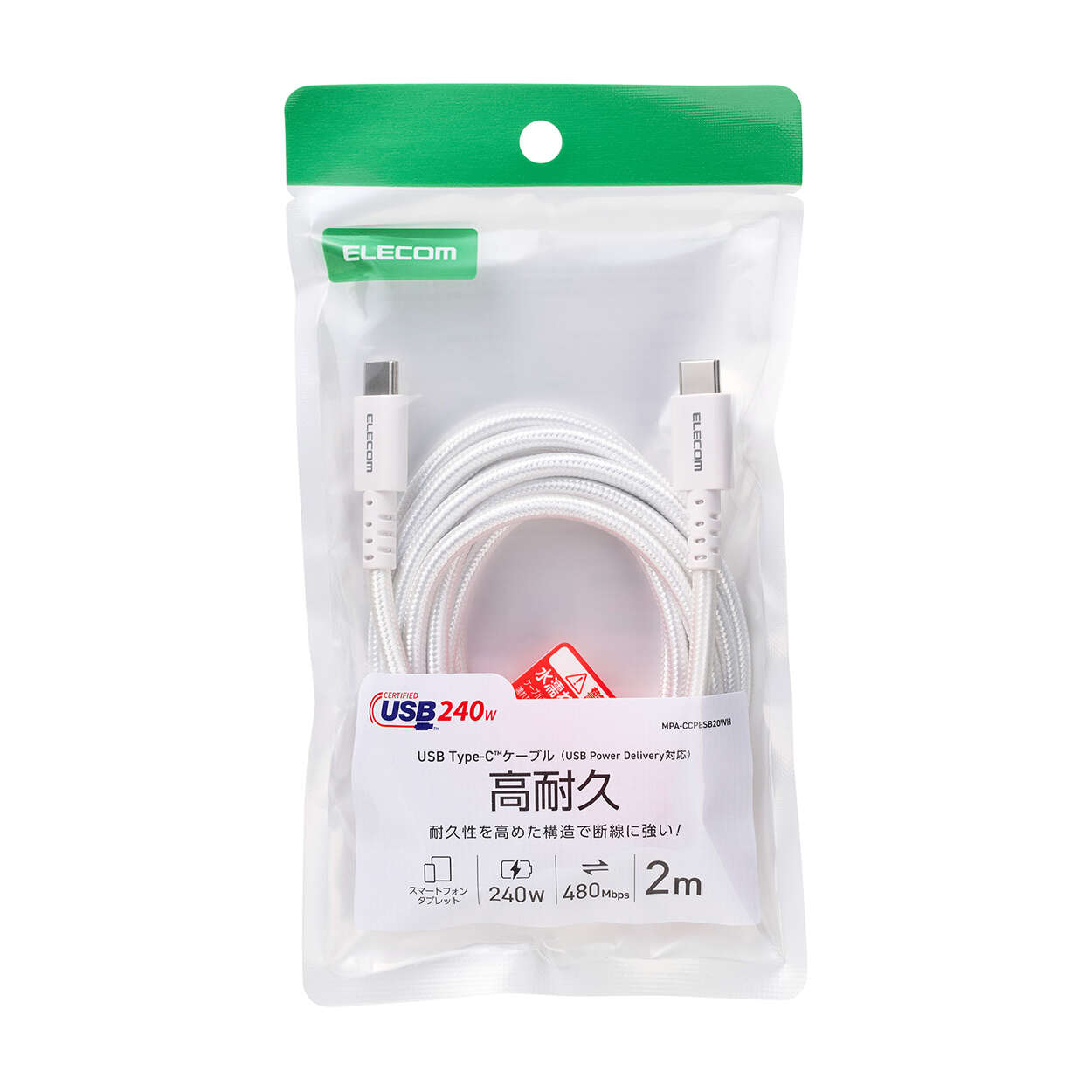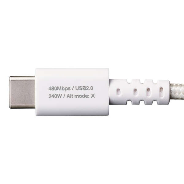ケーブル断線のストレスから解放!断線しやすいブッシュ部を強化してナイロンメッシュケーブルを使用した、日常使いの屈曲にも耐える高耐久モデルのUSB Type-C(TM)ケーブルです。USB Power Delivery EPR(最大240W)に対応し、スマートフォン・タブレット、パソコンなど消費電力が高い機器の高速充電が可能。USB Type-Cポートを搭載した機器同士を接続できるUSB2.0正規認証品ケーブルです。