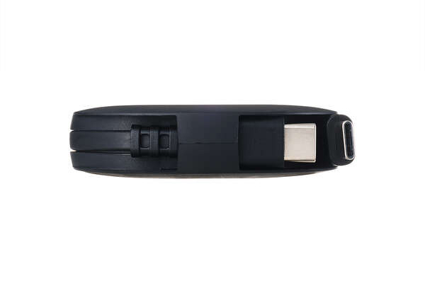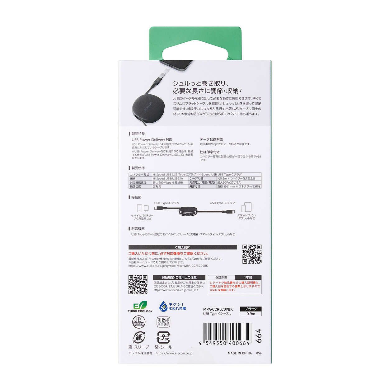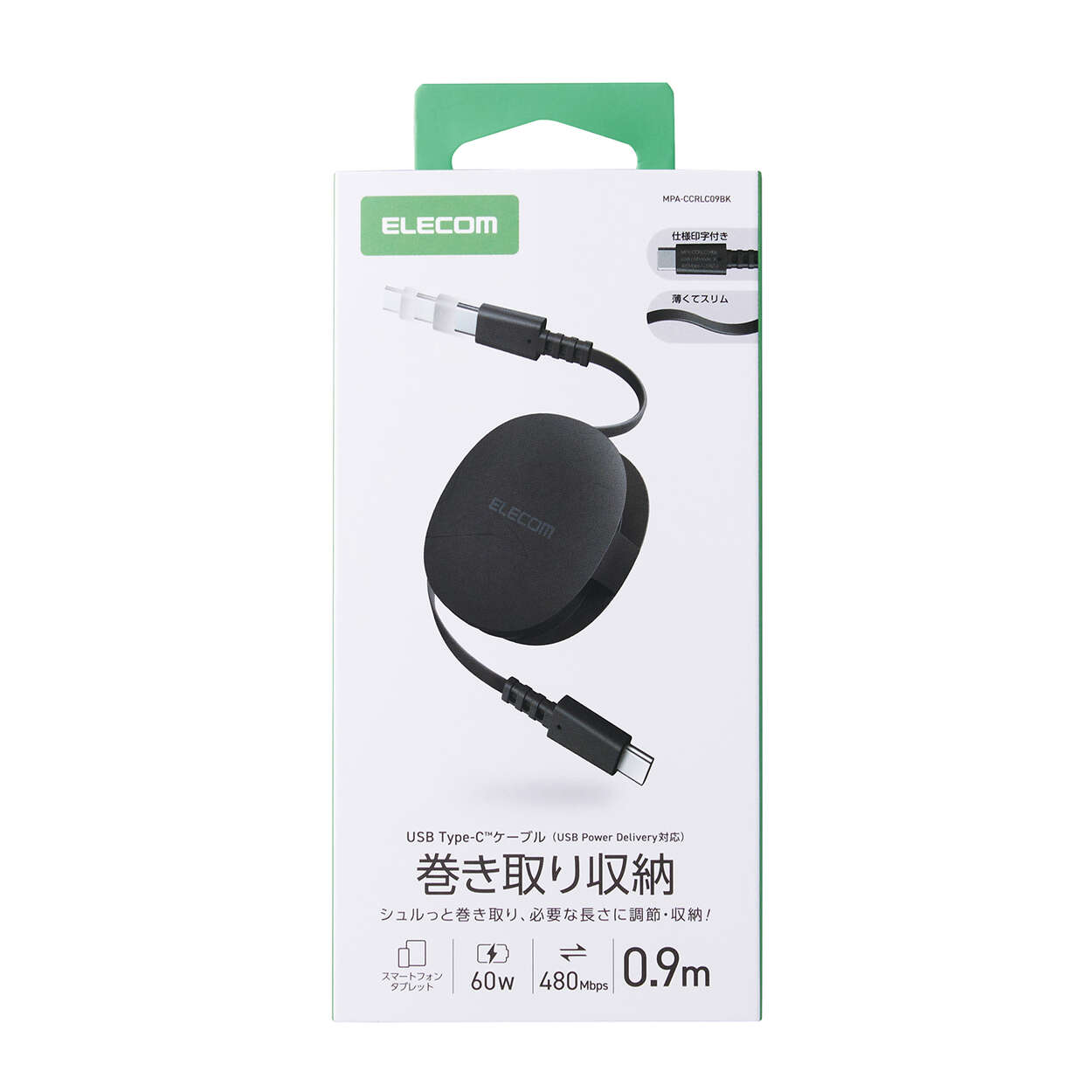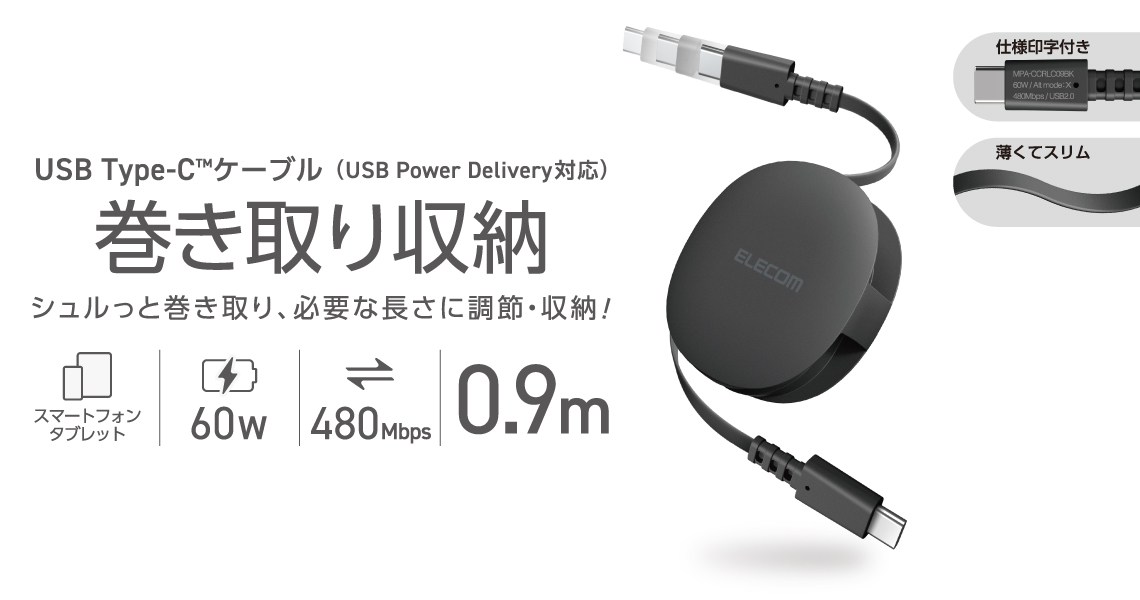 シュルッと収納、絡まずすっきり。約90cmのケーブルがコンパクトにまとまる、巻き取り式のUSB Type-C(TM) - USB Type-Cケーブルです。手のひらサイズのケースで、持ち運びに便利。片手で引っ張って使える片側巻き取り式です。