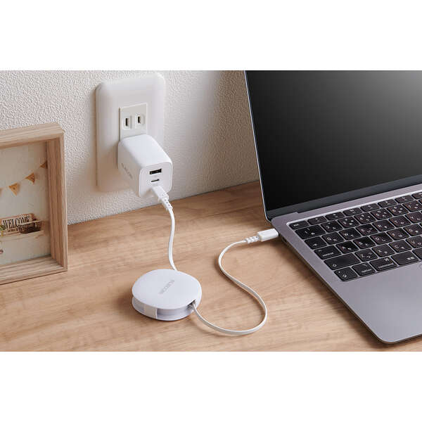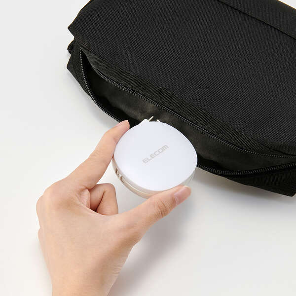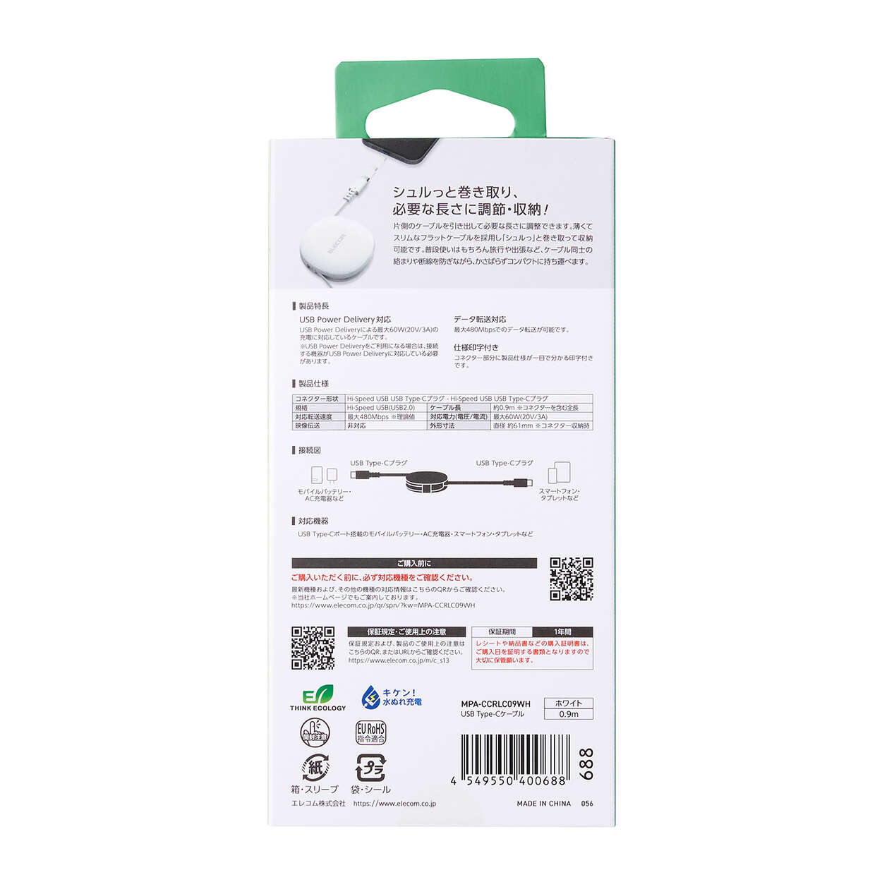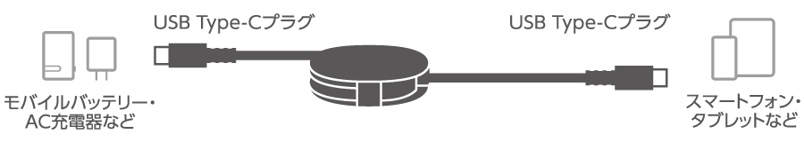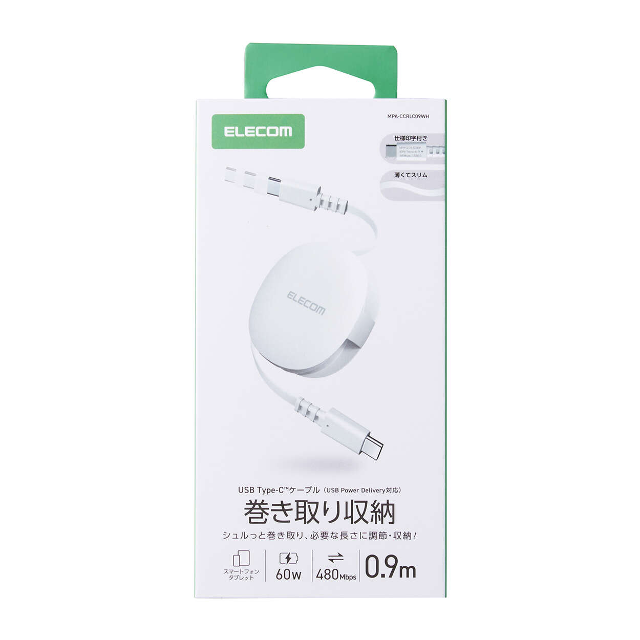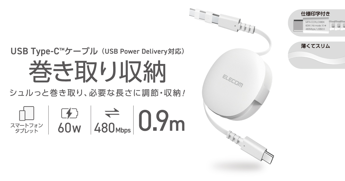 シュルッと収納、絡まずすっきり。約90cmのケーブルがコンパクトにまとまる、巻き取り式のUSB Type-C(TM) - USB Type-Cケーブルです。手のひらサイズのケースで、持ち運びに便利。片手で引っ張って使える片側巻き取り式です。