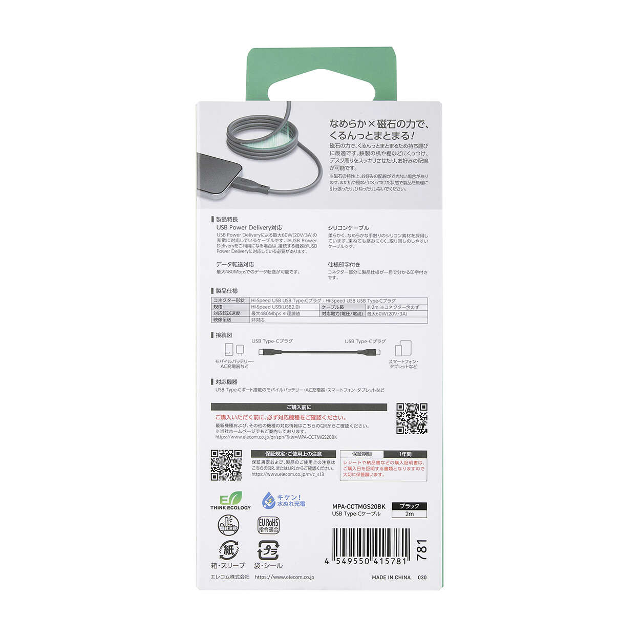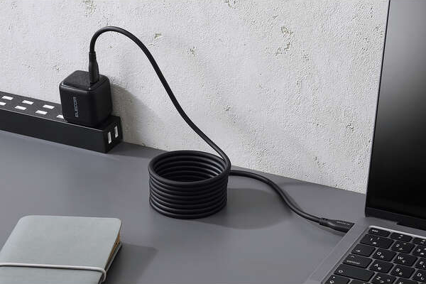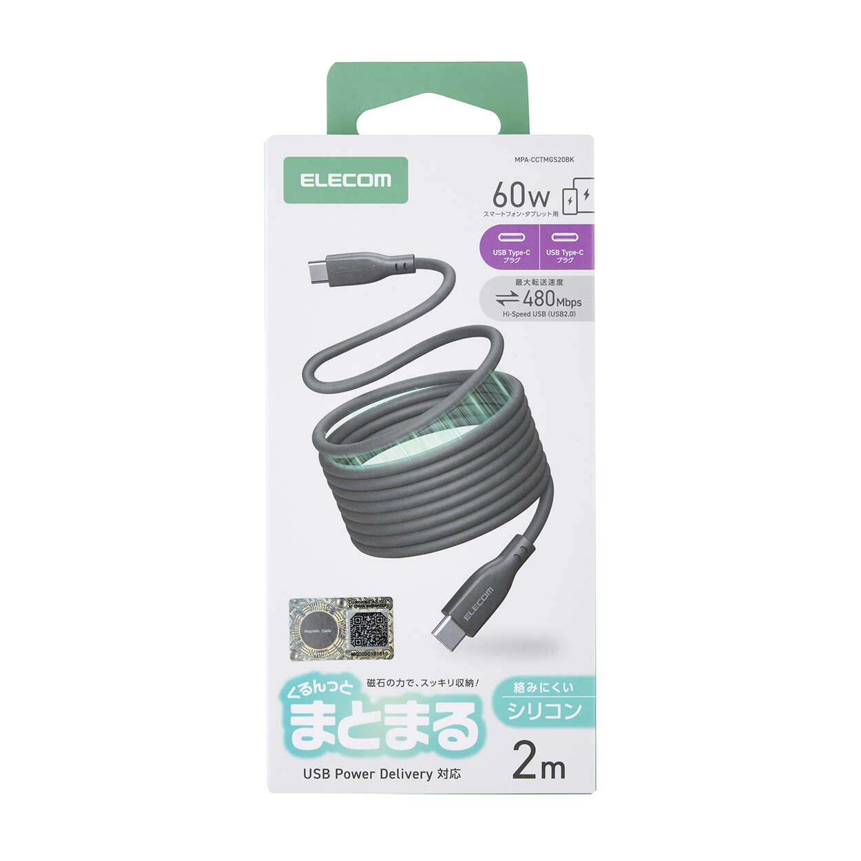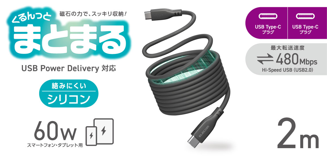 シリコン×磁石の力で、くるんとまとまり小さく収納!持ち運びに便利なUSB Type-C(TM)ケーブルです。鉄製の机や棚に吸着し、配線を自在にアレンジできます。なめらかで絡みにくいシリコン素材を採用。USB Power Delivery最大60Wの充電に対応し、スマートフォンやタブレットなどを充電できます。