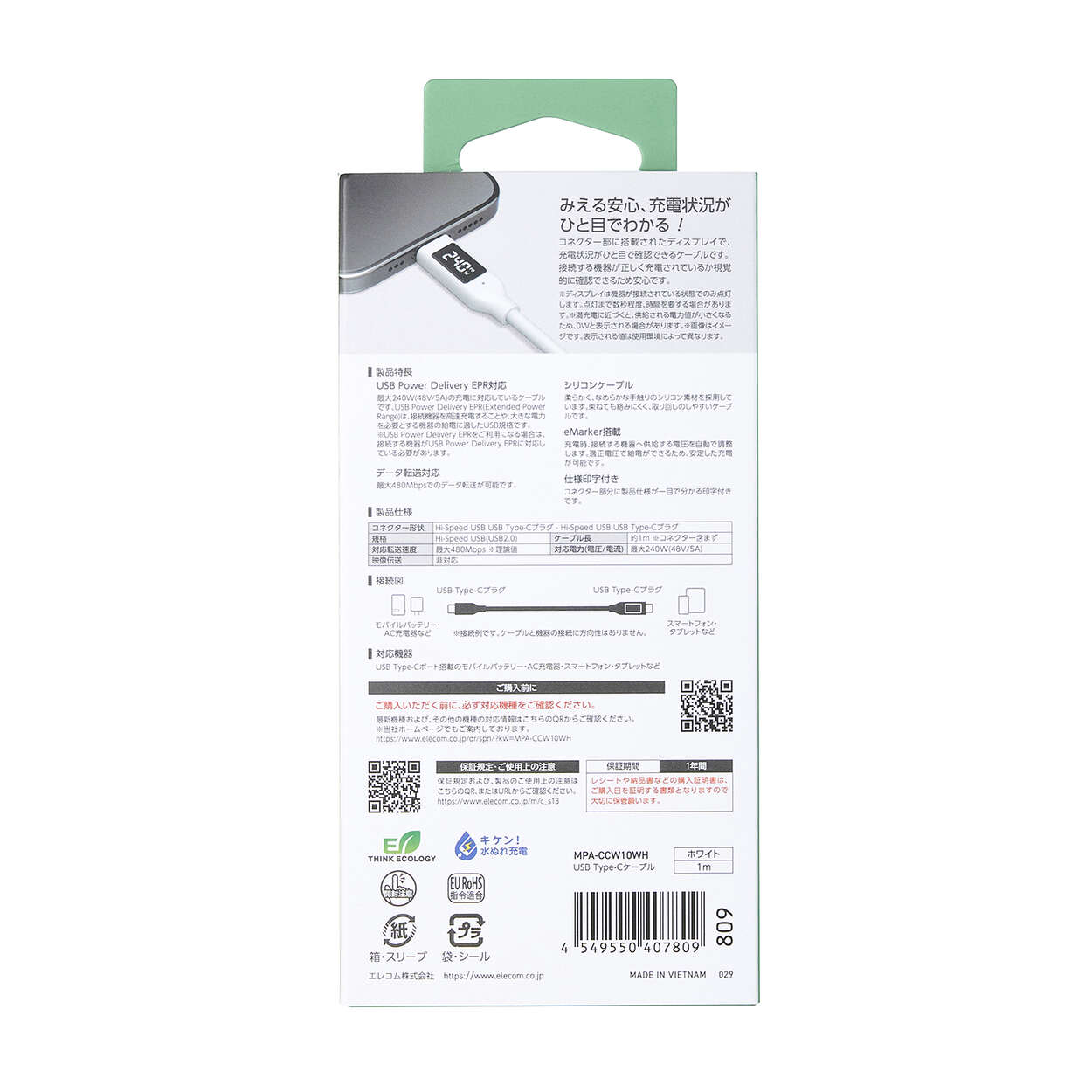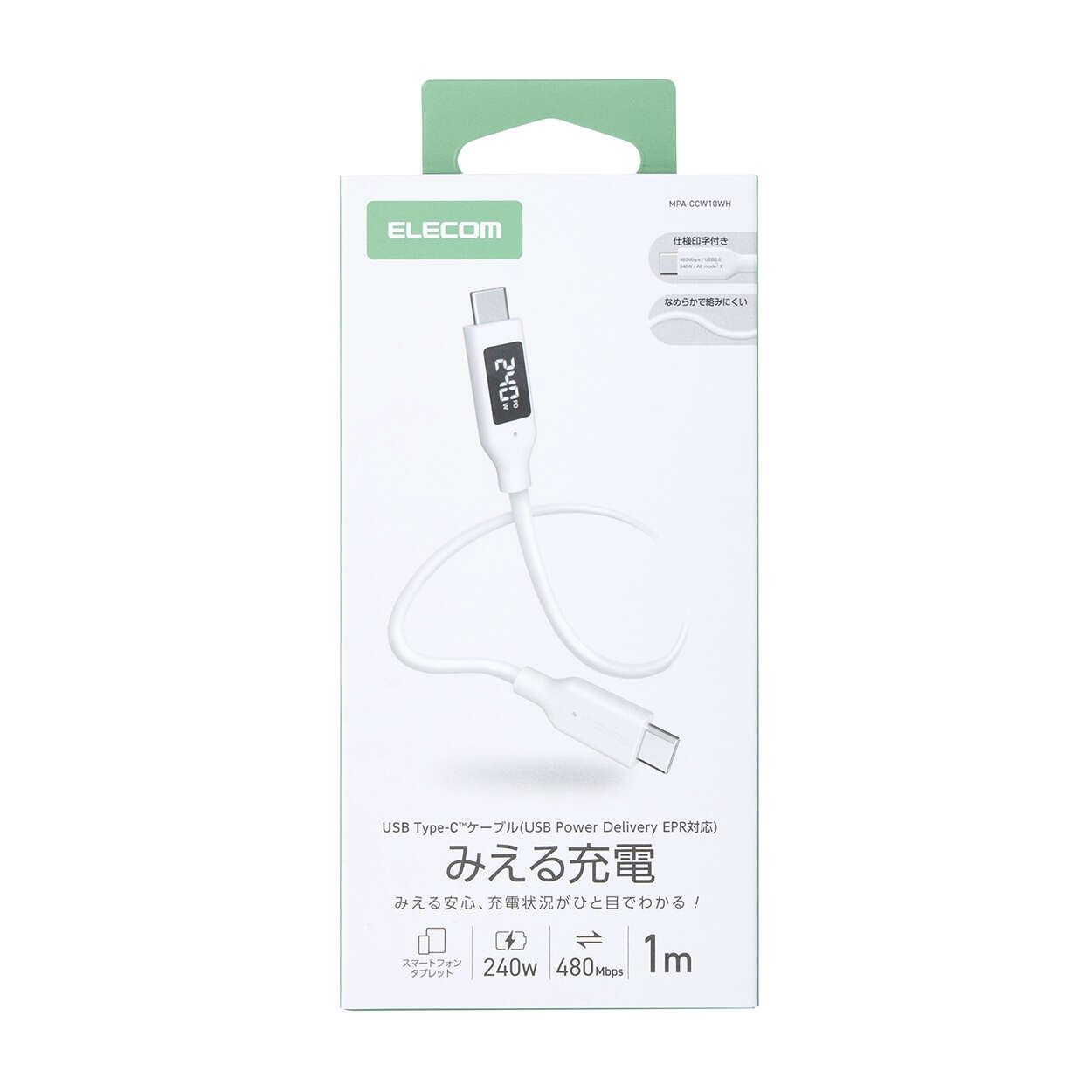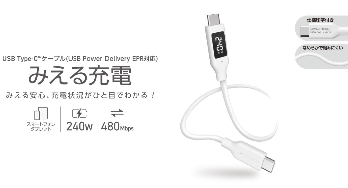 充電状況がひと目で分かる、電力ディスプレイ付きのUSB Type-C™-USB Type-Cケーブルです。