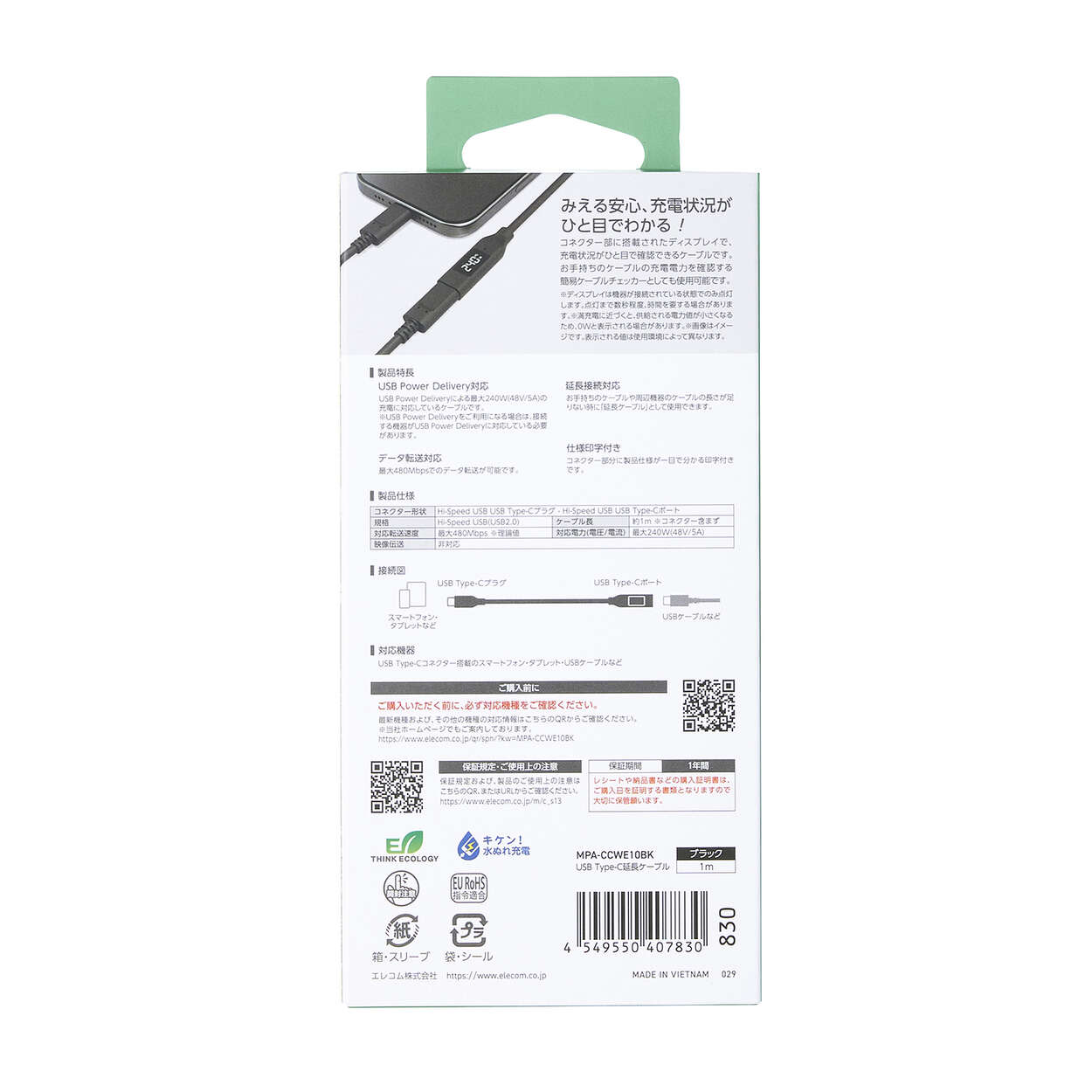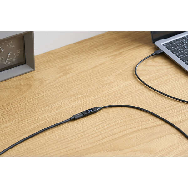 充電状況がひと目で分かる、電力ディスプレイ付きUSB Type-C(TM)延長ケーブルです。接続した機器への充電電力値がリアルタイムで確認でき、接続したケーブルが正しく充電できているか視覚的に確認できるため、安心です。最大240WのUSB Power Delivery充電や最大480Mbpsでのデータ転送が可能です。