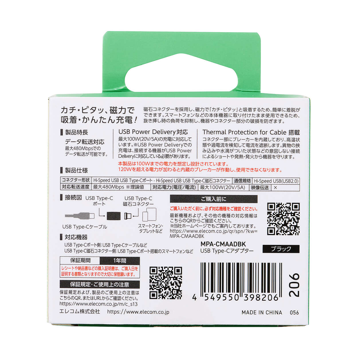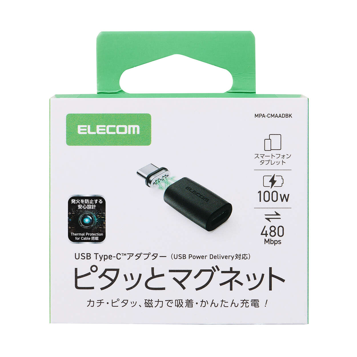 ピタッとくっついて、かんたん着脱&充電!磁力でしっかり接続するUSB Type-C(TM)着脱式コネクターを採用した、ストレートタイプのマグネットアダプターです。端子をスマートフォンなどの機器に挿したまま、ワンタッチでケーブルの着脱が可能。充電時に抜き挿しする手間がなく、機器やコネクター部分への負荷も軽減します。お手持ちのケーブルに本製品を接続すれば、簡単に着脱式コネクターに変換できます。コネクター部分にブレーカーを内蔵し、ホコリなどが入っても接続時のショートを防止して機器を守る安心設計です。