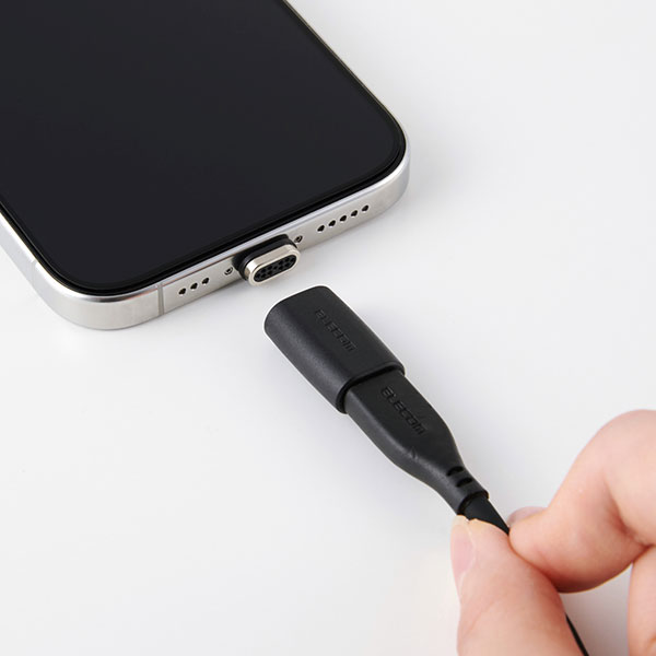 磁力でしっかり接続するUSB Type-C™着脱式コネクターを採用した、ストレートタイプのマグネットアダプターです。端子をスマートフォンなどの機器に挿したまま、ワンタッチでケーブルの着脱が可能。充電時に抜き挿しする手間がなく、機器やコネクター部分への負荷も軽減します。
