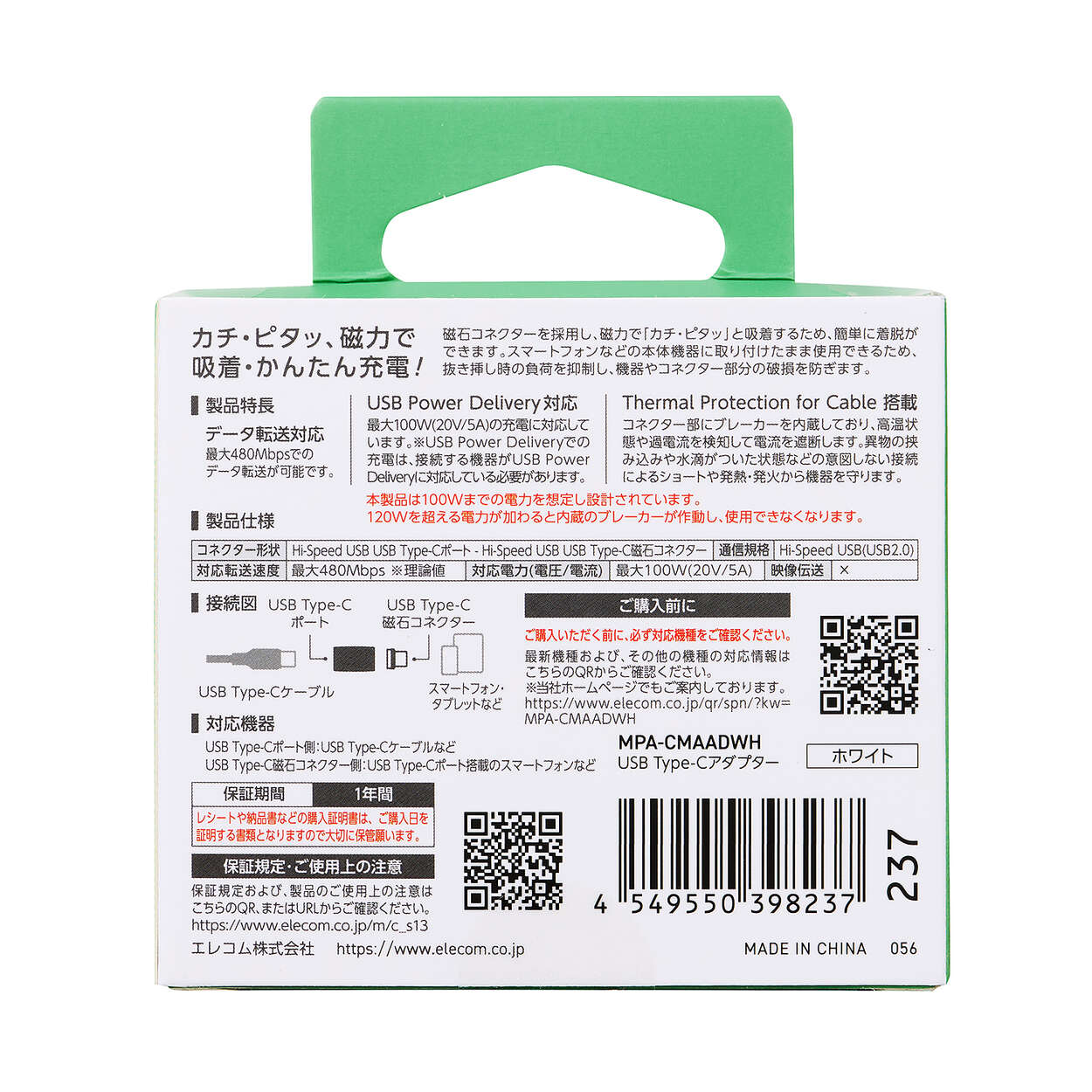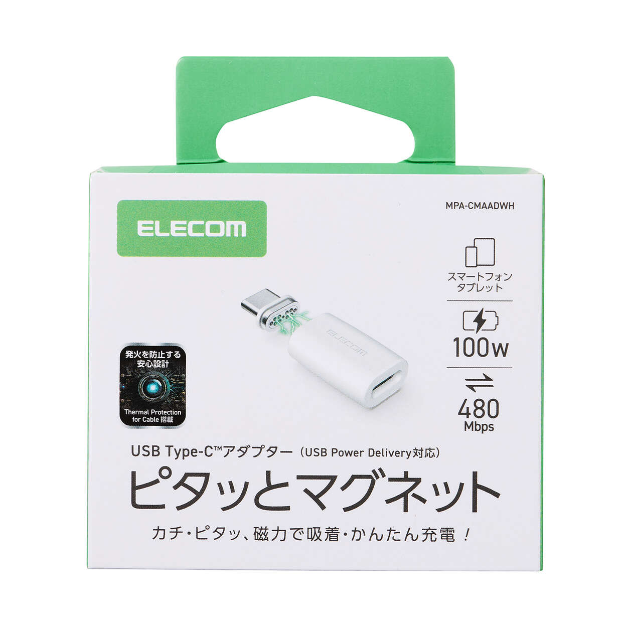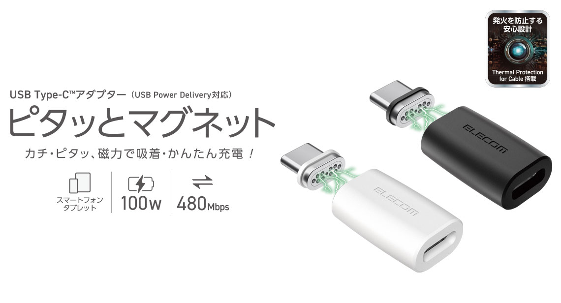 ピタッとくっついて、かんたん着脱&充電!磁力でしっかり接続するUSB Type-C(TM)着脱式コネクターを採用した、ストレートタイプのマグネットアダプターです。端子をスマートフォンなどの機器に挿したまま、ワンタッチでケーブルの着脱が可能。充電時に抜き挿しする手間がなく、機器やコネクター部分への負荷も軽減します。お手持ちのケーブルに本製品を接続すれば、簡単に着脱式コネクターに変換できます。コネクター部分にブレーカーを内蔵し、ホコリなどが入っても接続時のショートを防止して機器を守る安心設計です。