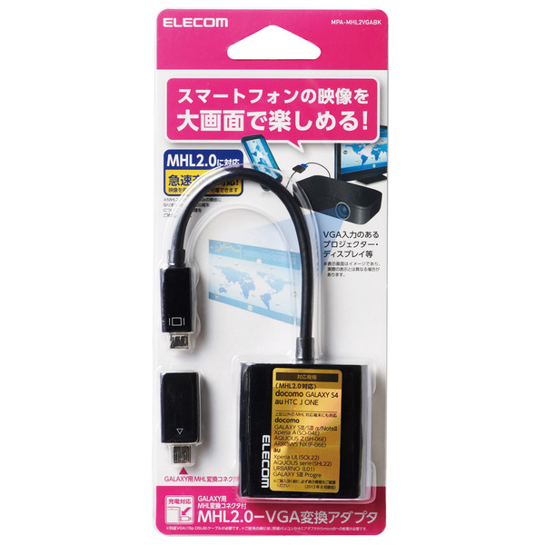 スマートフォンの映像を大画面で楽しめる。MHLに対応したスマートフォンの映像をVGAコネクタ対応機器の画面で楽しめるMHL2.0-VGA変換アダプタ。