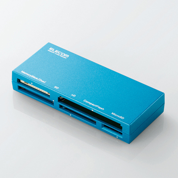 持ち運びや、使用後の収納にも便利なケーブル収納タイプ。最新のSDXCメモリーカードを含めた47+6メディアに対応したメモリカードリーダ。