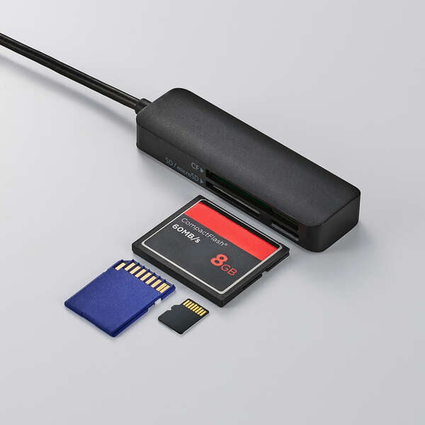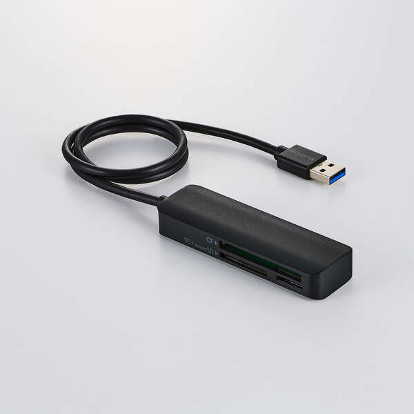 撮影データの転送をもっと速く快適に!パソコンへの接続に便利なUSB-Aプラグのケーブル付きメモリーカードリーダーです。SDカード、microSDカード、コンパクトフラッシュの3スロットを搭載し、デジタルカメラやアクションカメラの撮影データをパソコンへ転送可能。画像・映像データの編集やSNSへのアップロードに便利です。
