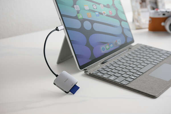 撮影データ転送がもっと速く快適になる、パソコンやスマホ、タブレットへの接続に便利なUSB Type-C™プラグのケーブル付きメモリーカードリーダーです。