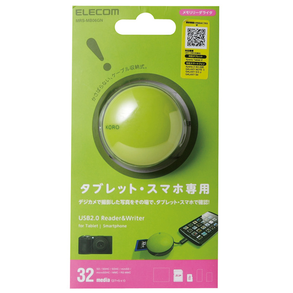 タブレットやスマートフォンにそのまま接続できるUSB[microB]コネクタを搭載!ケーブルを本体に収納でき、コロンとしたフォルムが愛らしいメモリリーダライタ。