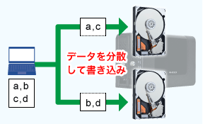 連続したデータをバラバラに2台のハードディスクに書き込みます。分割されたデータを同時書き込み・読み込みするため、データの読み書きが高速になります。ハードディスの容量は2台のハードディスクの合計値となりますが、使用しているハードディスクが1台でも故障すると、データの復旧が難しいとうデメリットもあります。