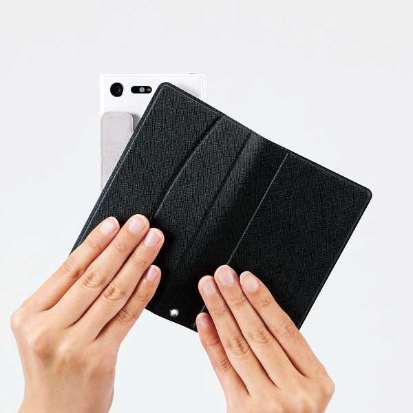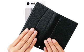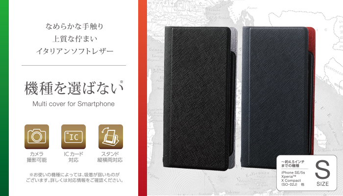 スマートフォンがピタッとくっつく自己吸着シートを採用し、機種を選ばずご使用いただけるマルチカバーです。