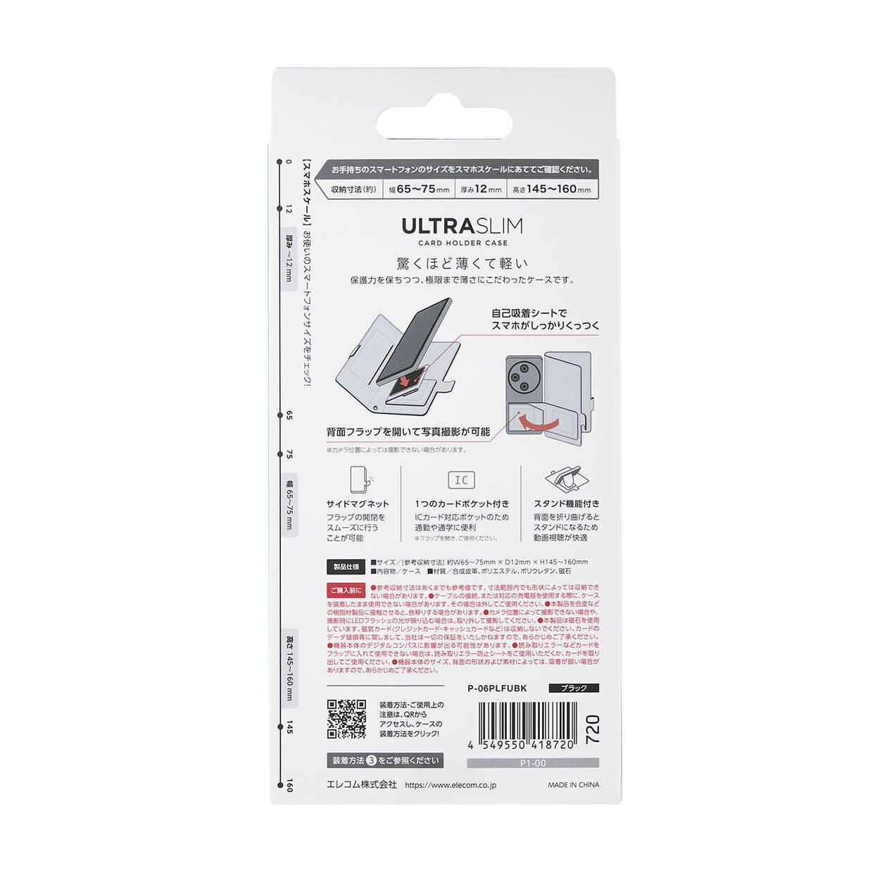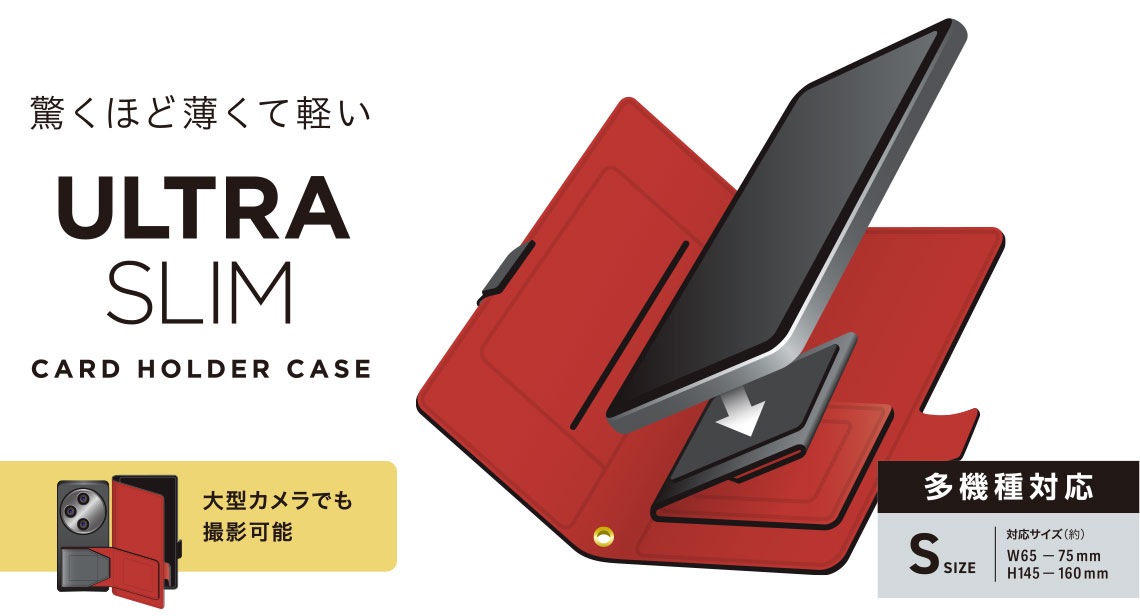 大型カメラの端末にも対応した、本体の薄さや軽さを損なわない、薄型・軽量タイプの手帳型マルチスマホケース(Sサイズ)です。