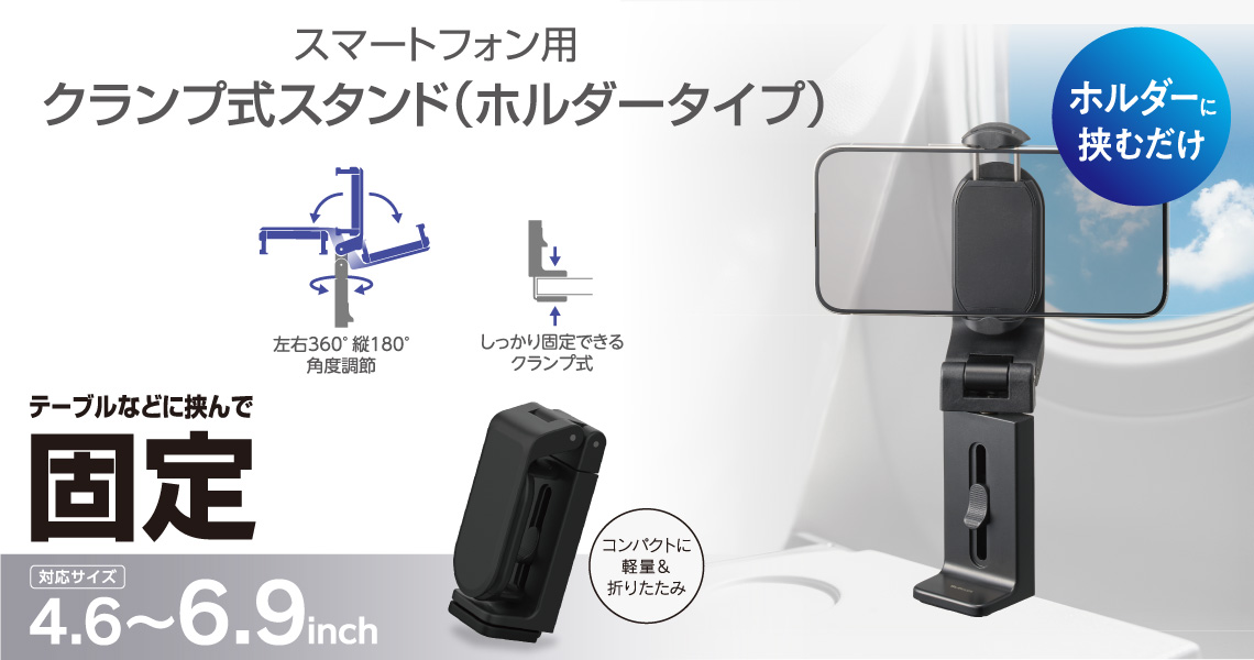 手ぶらで動画&Webを楽しめる!天板に挟んで固定できる、クランプ式のスマホスタンドです。新幹線や飛行機内の座席テーブルでの使用にもおすすめ。4.6~6.9インチまでのスマートフォンをしっかり固定できる、ホルダータイプです。