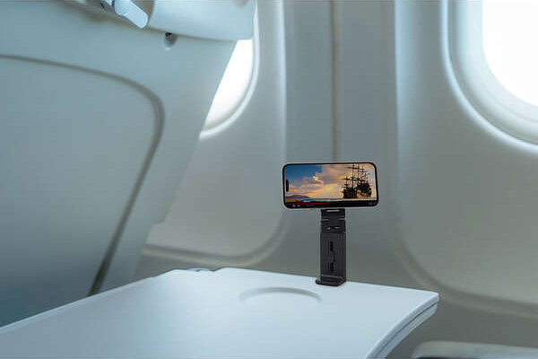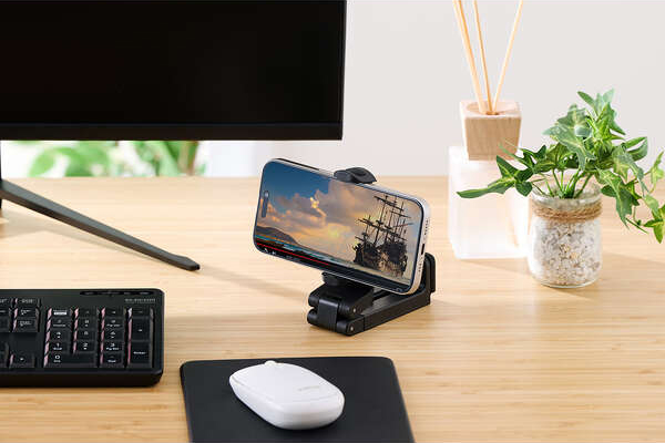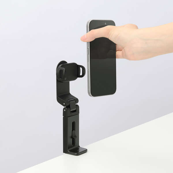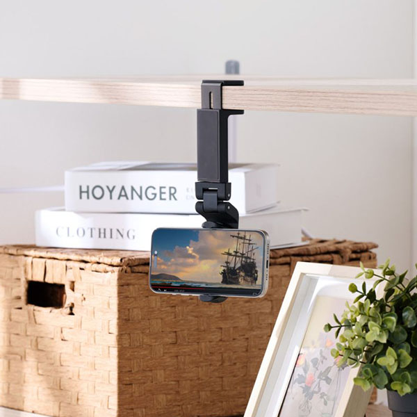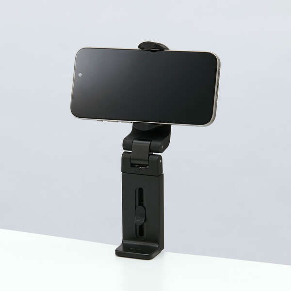 デスクなどの水平な天板に挟んで固定できるクランプ式で、スマートフォンを手に持たずにWebサイトや動画の閲覧を楽しめます。新幹線や飛行機内の座席テーブルでの使用にもおすすめです。