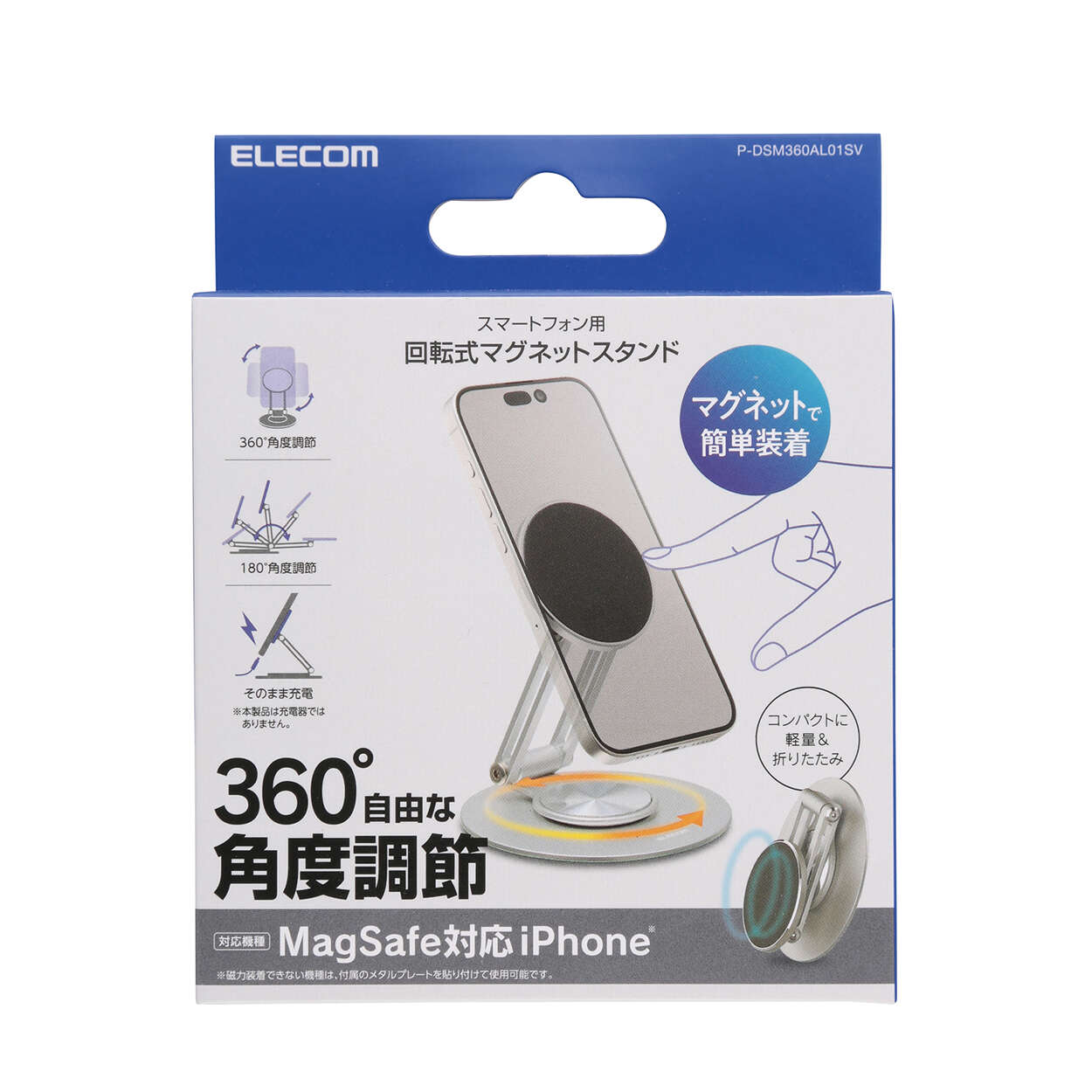 折り畳み式でコンパクトに持ち運べる!マグネットで簡単にスマートフォンの着脱ができる、MAGKEEPシリーズのスマホスタンドです。MagSafe非対応でも使用できるメタルプレート付き。マグネット部分は360度回転し、縦向き・横向きの切り替えもスムーズ。土台部分も回転するため、設置場所や使用シーンに合わせて自由に使えます。