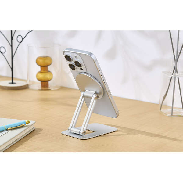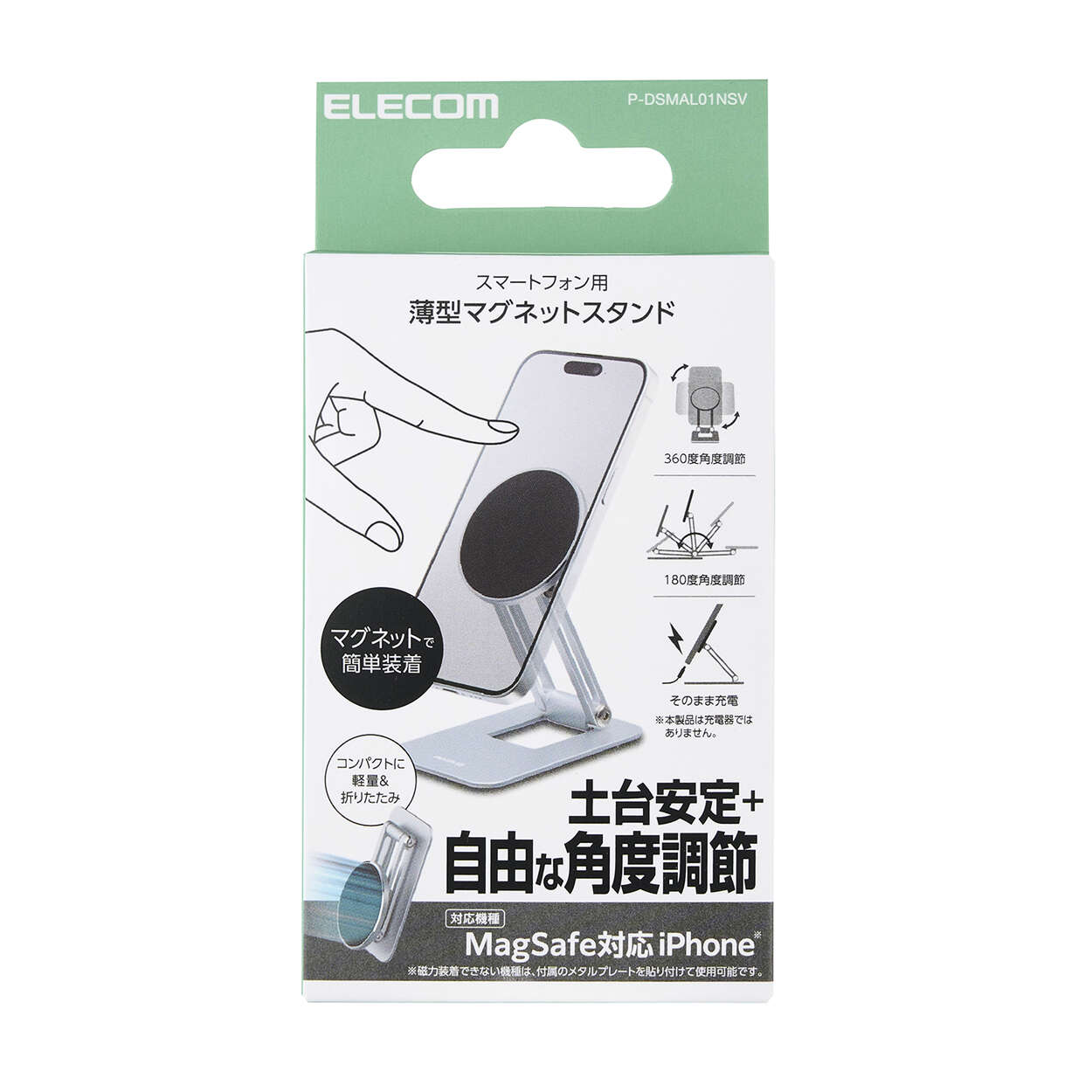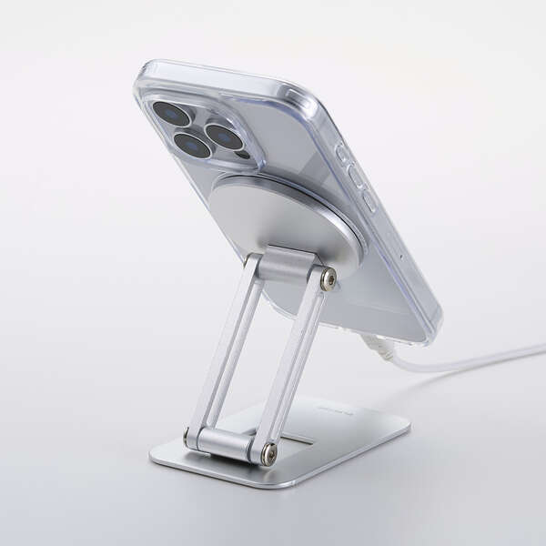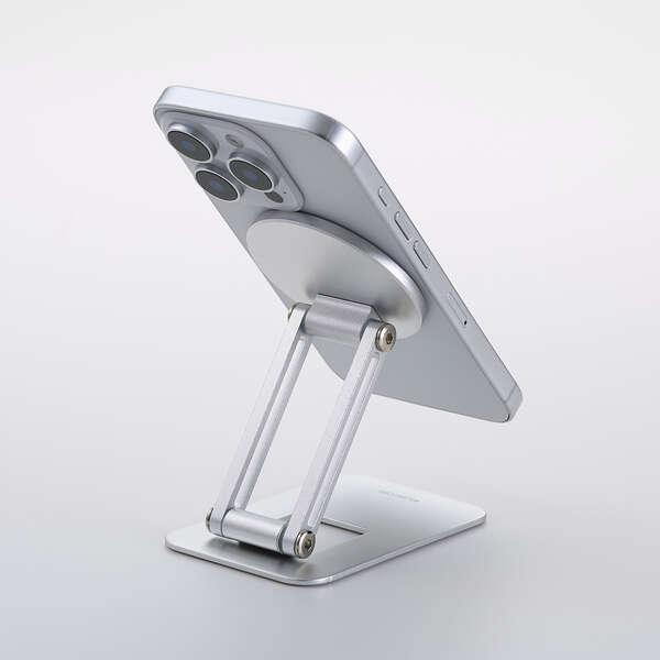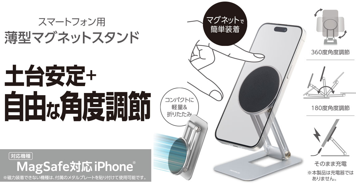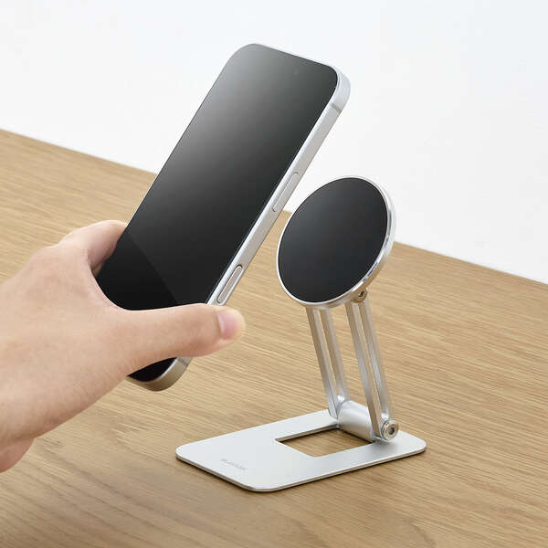 マグネットで簡単にスマートフォンの着脱可能。MagSafe対応スマホケースや付属のメタルプレートと併用することで、MagSafe非対応の端末でも使用できます。