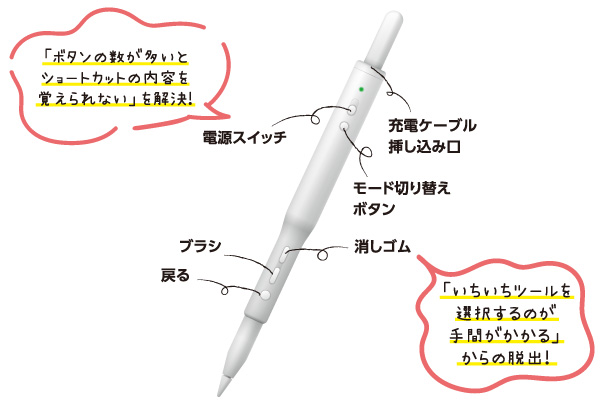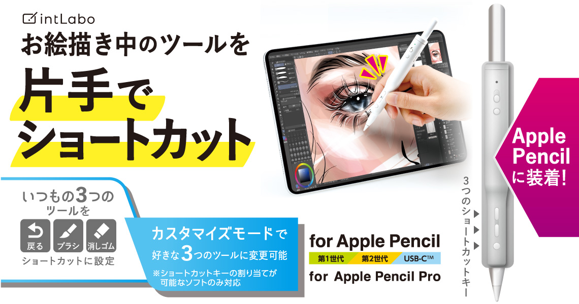 片手でサクッとショートカット!お絵かきの作業時間を短縮し、描く楽しさをもっと自由にする“draw´(ドローダッシュ)”シリーズのショートカットグリップです。Apple Pencilをスライドさせて簡単に装着でき、3つのショートカットキーを使うことで、頻繁に使用するツールやメニューを片手で素早く操作可能。デフォルトモードとカスタマイズモードもボタン1つで切り替えられ、作業効率が大幅に向上します。