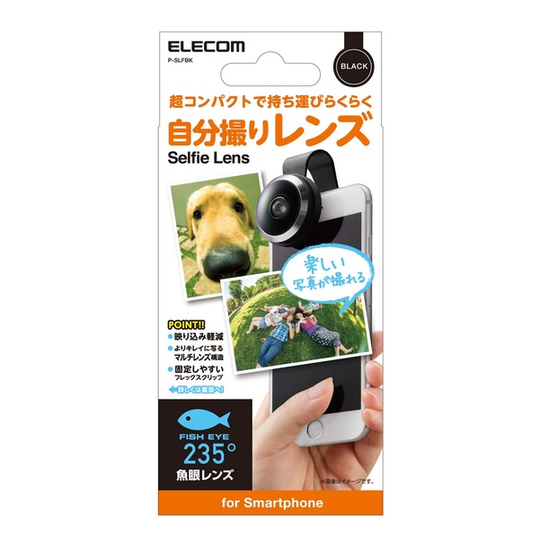 スマートフォンでひと味違う、楽しい写真が撮れる。よりきれいに写るマルチレンズ構造を採用し、周囲を約235度の画角で撮影できる魚眼タイプ(235°)のスマートフォン用自撮りレンズ。