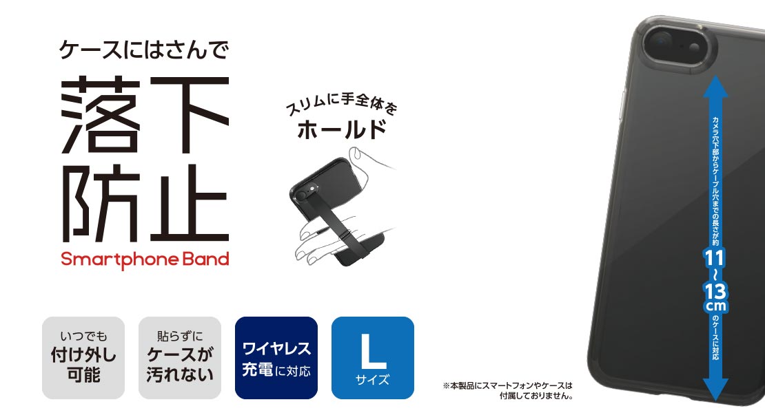 ケースと機器本体に挟み込んでスマートフォンの落下を防ぐ、薄くてかさばらずにワイヤレス充電にも対応するシリコン製のスマホバンドLサイズです。