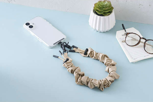 くしゅくしゅとした立体感が目を引く、ミニマルかつスポーティーな印象のハンドストラップです。手首や腕から提げて持ち歩けるので、両手がふさがらずいつでもサッとスマートフォンの操作ができます。手元にほどよい存在感を添えながらも軽量で、持ち運びやすい仕様です。