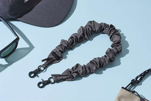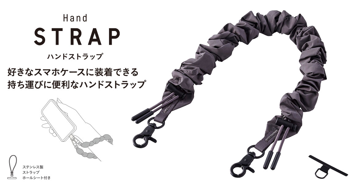くしゅくしゅとした立体感が目を引く、ミニマルかつスポーティーな印象のハンドストラップです。手首や腕から提げて持ち歩けるので、両手がふさがらずいつでもサッとスマートフォンの操作ができます。手元にほどよい存在感を添えながらも軽量で、持ち運びやすい仕様です。