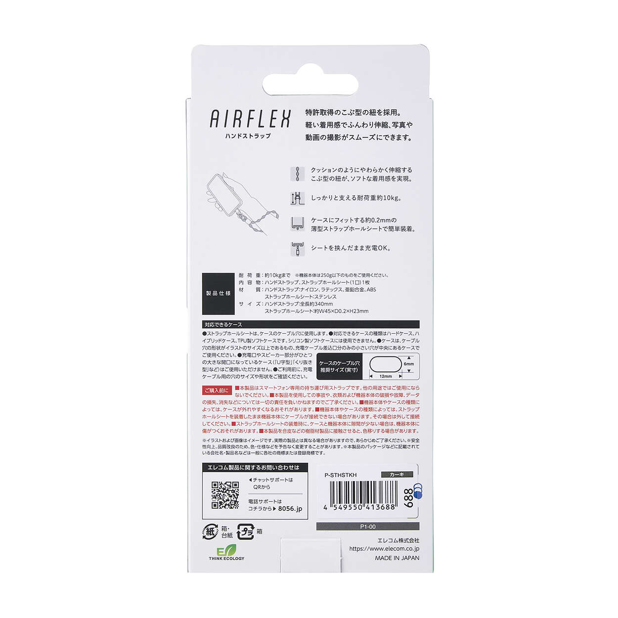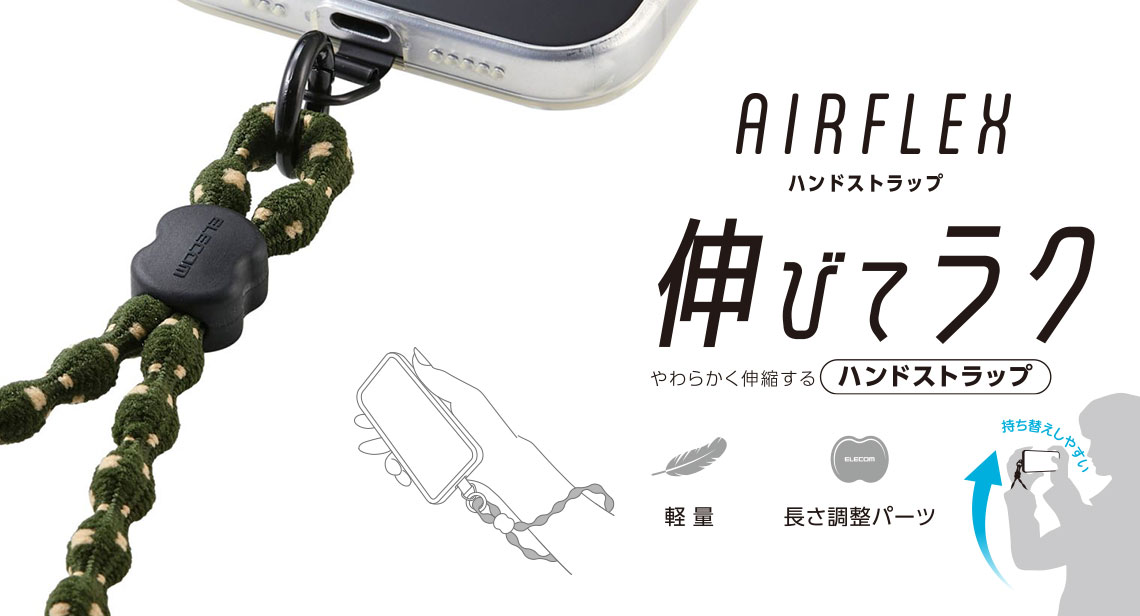 特許取得のこぶ型ひもを使った、柔らかく伸びるAIRFLEXシリーズのスマホハンドストラップです。手首に掛けたままでも写真撮影や電子決済がスムーズにでき、両手が空くので外出やお出かけも快適。どんなコーデにも合わせやすいカジュアルデザインです。