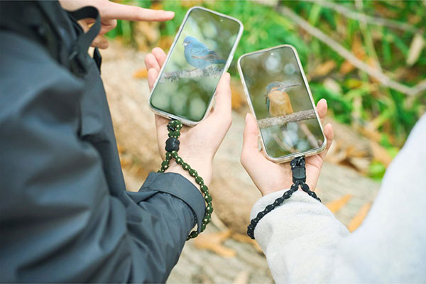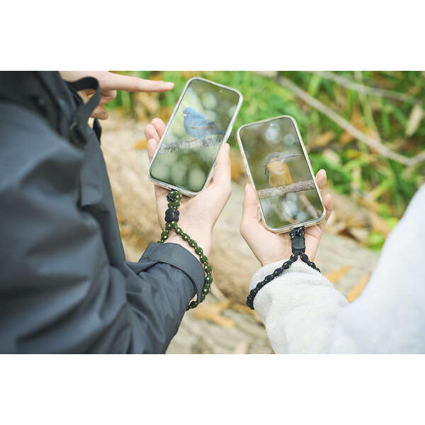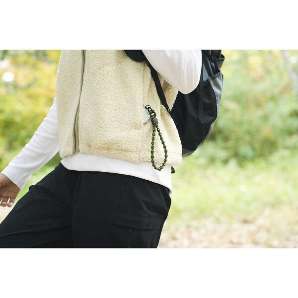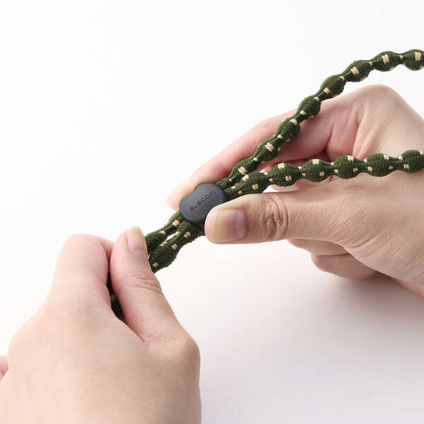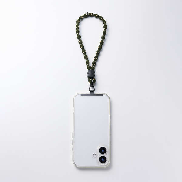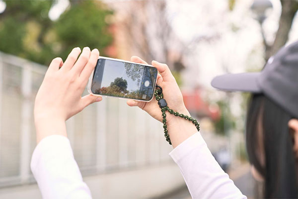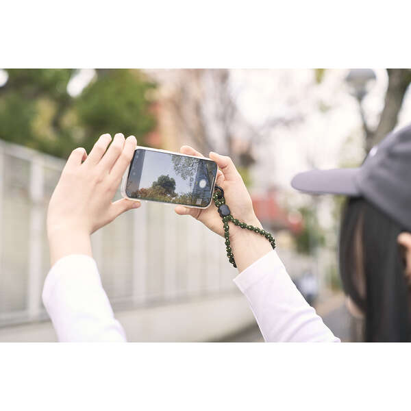 ひもは柔らかく伸縮し、手首に掛けたままでも写真撮影や電子決済をスムーズに行えます。