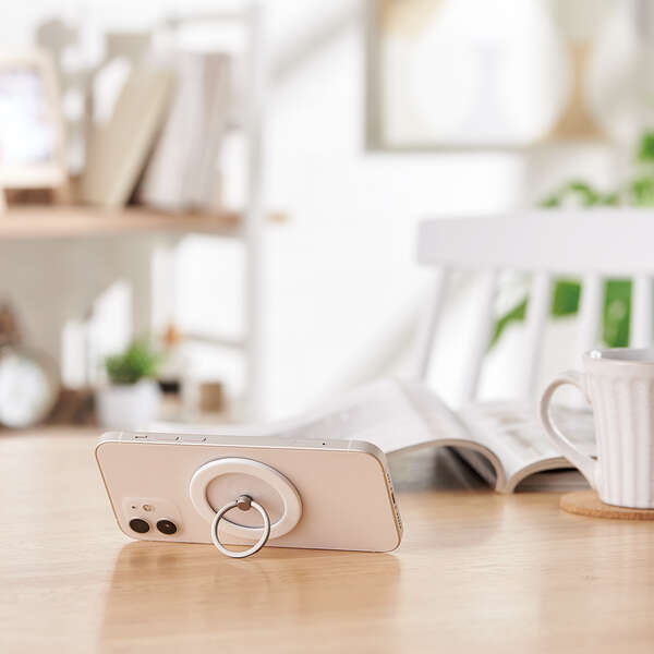 MagSafe対応iPhoneの背面に磁石の力で取り付けることができる、MAGKEEPスマホリングです。リングが磁力で着脱可能であるため、気軽にリングを外してワイヤレス充電や電子決済に素早く対応できます。スマホ本体のデザインを損ねない、クリアパーツを採用しています。