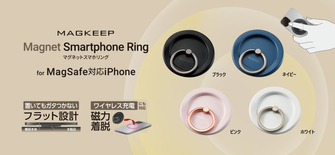 MagSafe対応iPhoneの背面に磁石の力で取り付けることができる、MAGKEEPスマホリングです。