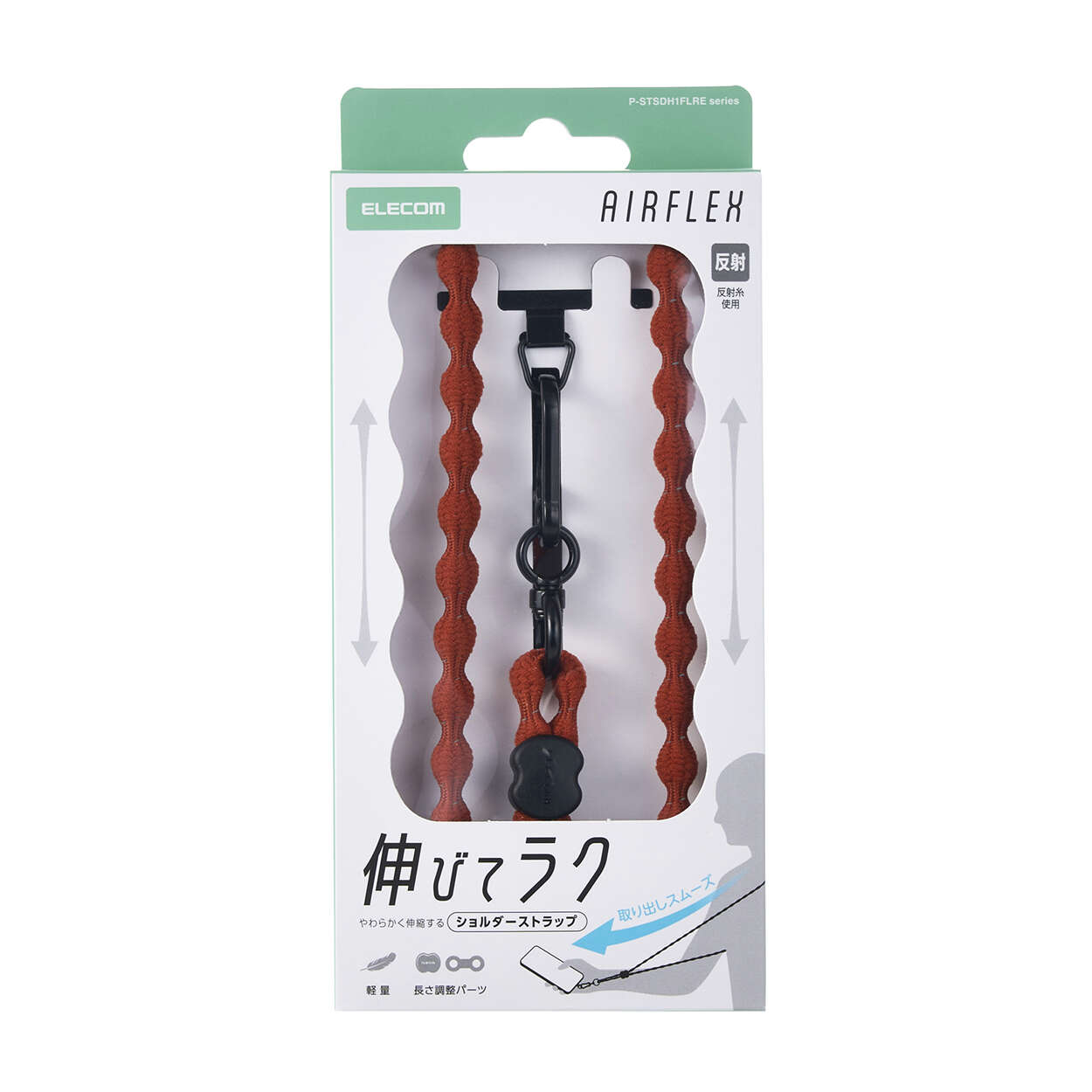 特許取得のこぶ型ひもを使った、柔らかく伸びるAIRFLEXシリーズのショルダーストラップです。肩に掛けたままでも電子決済や改札の通過がスムーズにでき、両手が空くので外出やお出かけも快適。反射糸が光を反射するため、夜間の外出時も安心して使えます。