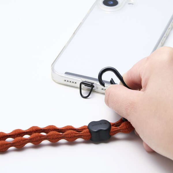 ケースにフィットする0.2mmの薄型ストラップホールシートを付属。ケースにストラップホールがなくても、スマートフォンとケースの間に挟むだけで使用できます。