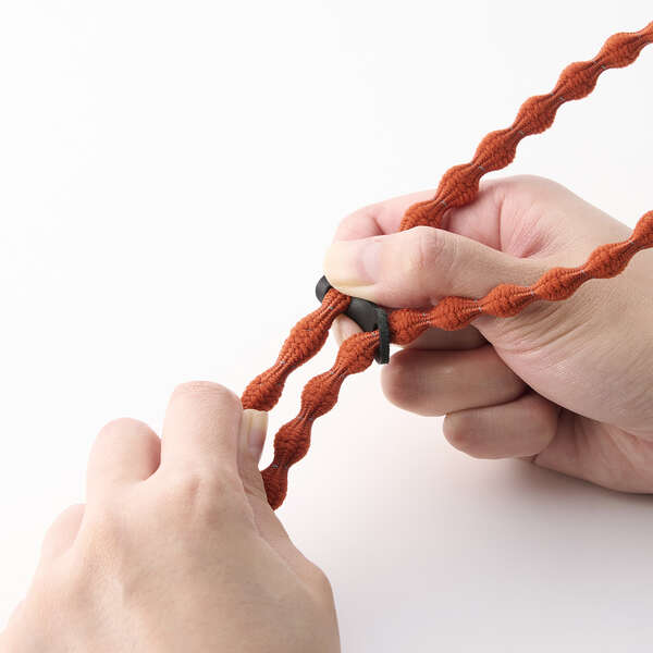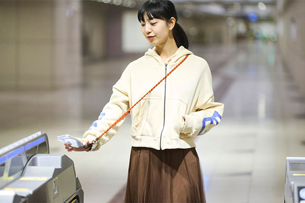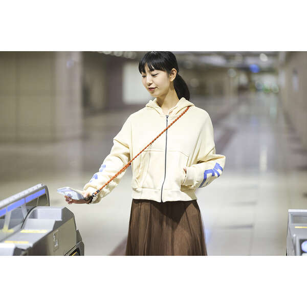 ひもは柔らかく伸縮し、肩に掛けたままでも電子決済や改札の通過がスムーズにできます。