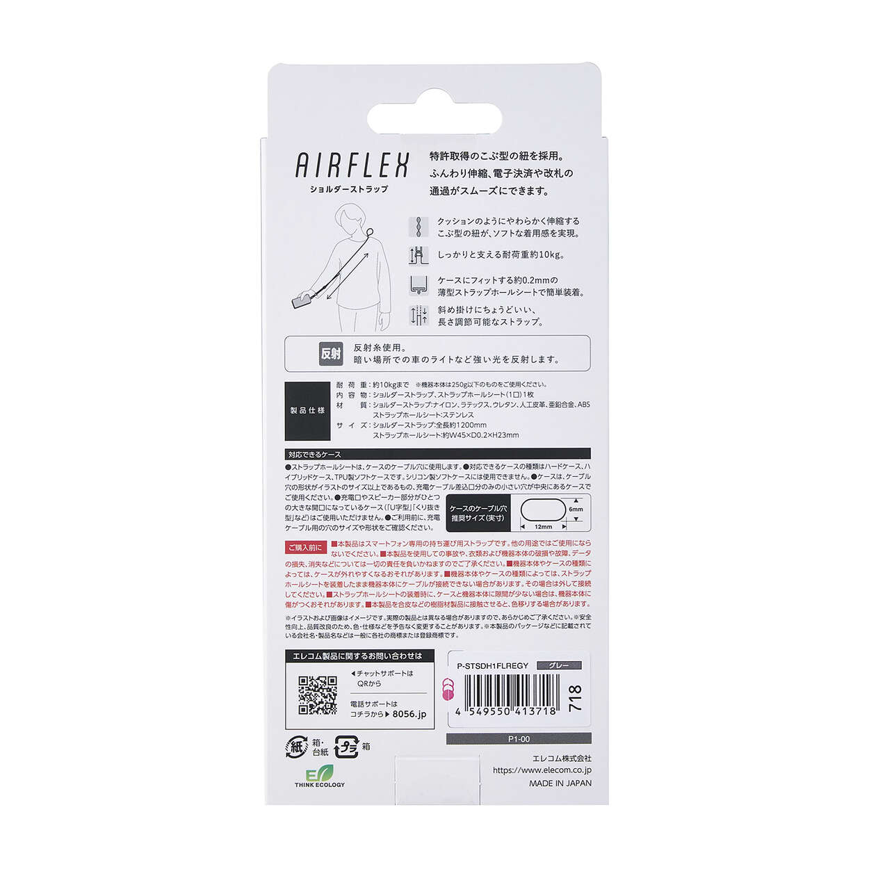 特許取得のこぶ型ひもを使った、柔らかく伸びるAIRFLEXシリーズのショルダーストラップです。肩に掛けたままでも電子決済や改札の通過がスムーズにでき、両手が空くので外出やお出かけも快適。反射糸が光を反射するため、夜間の外出時も安心して使えます。