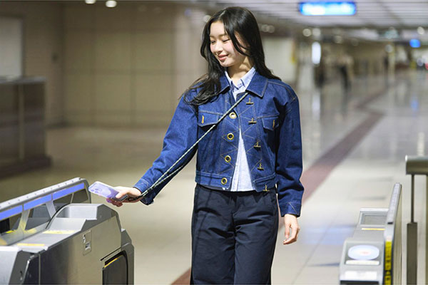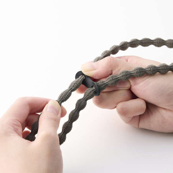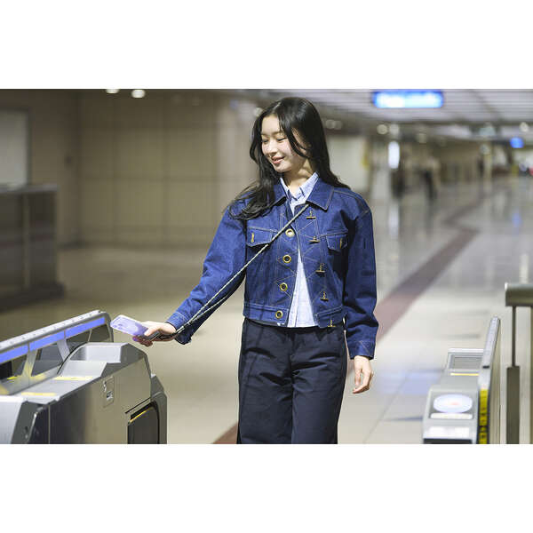 ひもは柔らかく伸縮し、肩に掛けたままでも電子決済や改札の通過がスムーズにできます。
