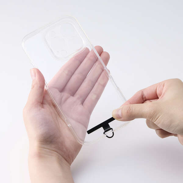 ケースにフィットする0.2mmの薄型ストラップホールシートを付属。ケースにストラップホールがなくても、スマートフォンとケースの間に挟むだけで使用できます。