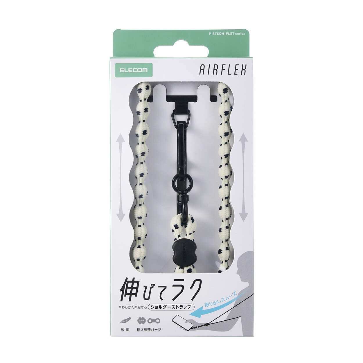 特許取得のこぶ型ひもを使った、柔らかく伸びるAIRFLEXシリーズのショルダーストラップです。肩に掛けたままでも電子決済や改札の通過がスムーズにでき、両手が空くので外出やお出かけも快適。どんなコーデにも合わせやすいカジュアルデザインです。
