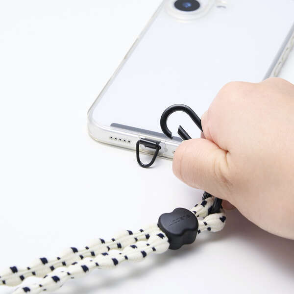 ケースにフィットする0.2mmの薄型ストラップホールシートを付属。ケースにストラップホールがなくても、スマートフォンとケースの間に挟むだけで使用できます。