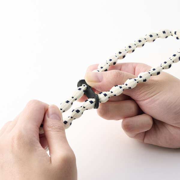 ひもは柔らかく伸縮し、肩に掛けたままでも電子決済や改札の通過がスムーズにできます。