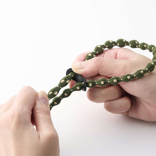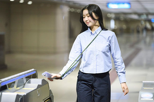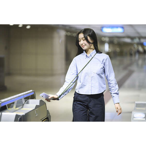 ひもは柔らかく伸縮し、肩に掛けたままでも電子決済や改札の通過がスムーズにできます。