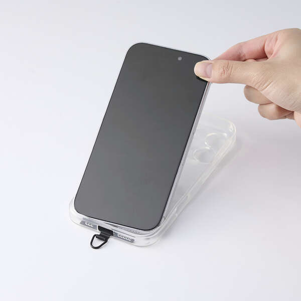 ケースにフィットする0.2mmの薄型ストラップホールシートを付属。ケースにストラップホールがなくても、スマートフォンとケースの間に挟むだけで使用できます。