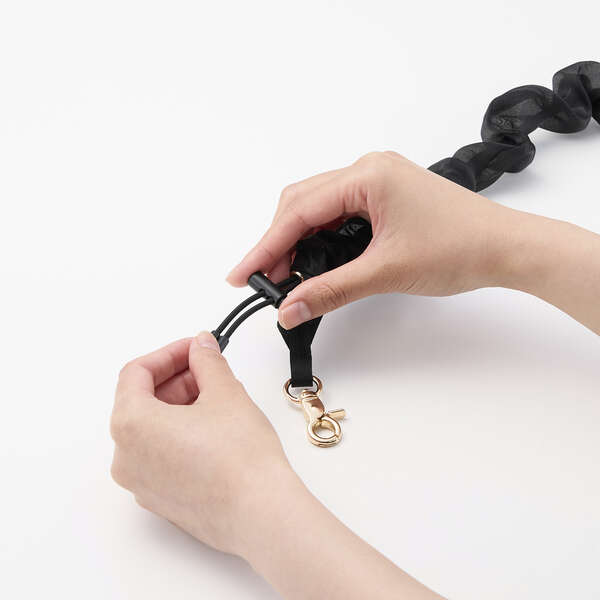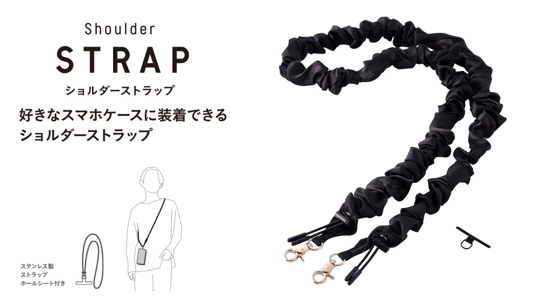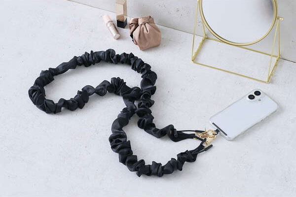 くしゅくしゅとした立体感と透け感のある生地が、大人の抜け感を演出するスマホショルダーストラップです。両手が空いて、普段のお出かけはもちろん、お仕事や旅行などのイベント時にも活躍。落下、盗難、紛失防止にもなります。軽量なポリエステル素材で肩にやさしく、長さ調整も可能なため自分らしいスタイルで使えます。