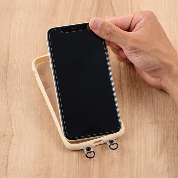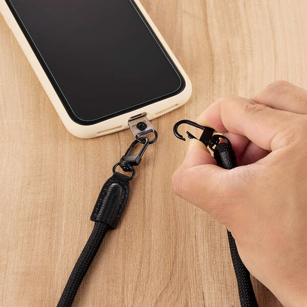 ケースにストラップホールがなくても、付属のストラップシートをスマートフォンとケースの間に挟むだけで使用でき、取り外しも簡単です。