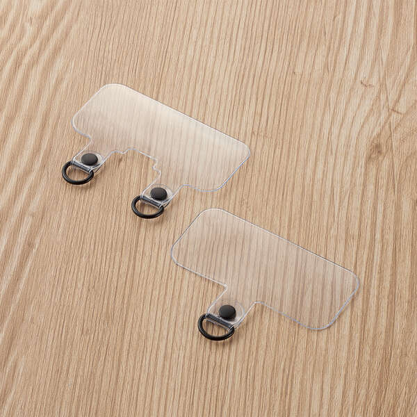 ケーブル穴1口用とスピーカー穴2口用の2種類のストラップシート(透明)が付属しているので、どちらのタイプのケースにも使用できます。ストラップシートはスマートフォンやケースを傷つけにくい柔らかい素材を使用しています。