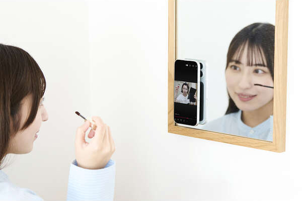 鏡に貼り付ければ、メイク中の画面チェックもスムーズに行えます。