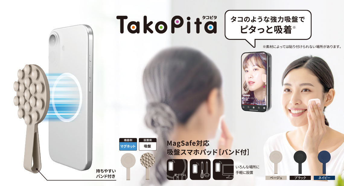 日常の“ながらスマホ”をより便利に!壁や鏡、窓ガラスなどの平らな面に、タコの吸盤のようにピタッと吸着する“TakoPita”スマホパッドです。強力な磁力でMagSafe対応スマホケースやiPhoneをしっかり固定し、両手を使わずにスマートフォンの操作や動画視聴が可能。落下防止に役立つバンド付きです。