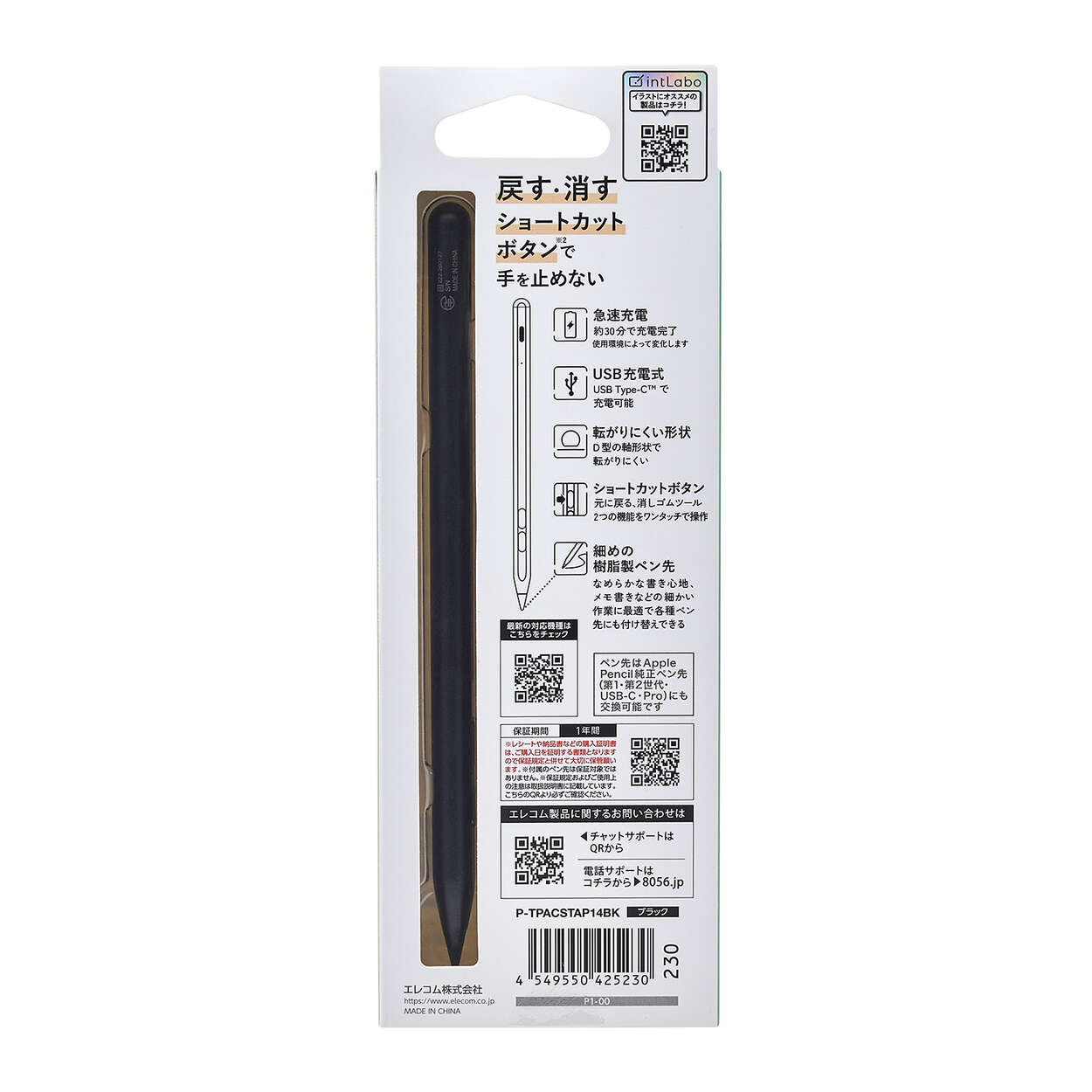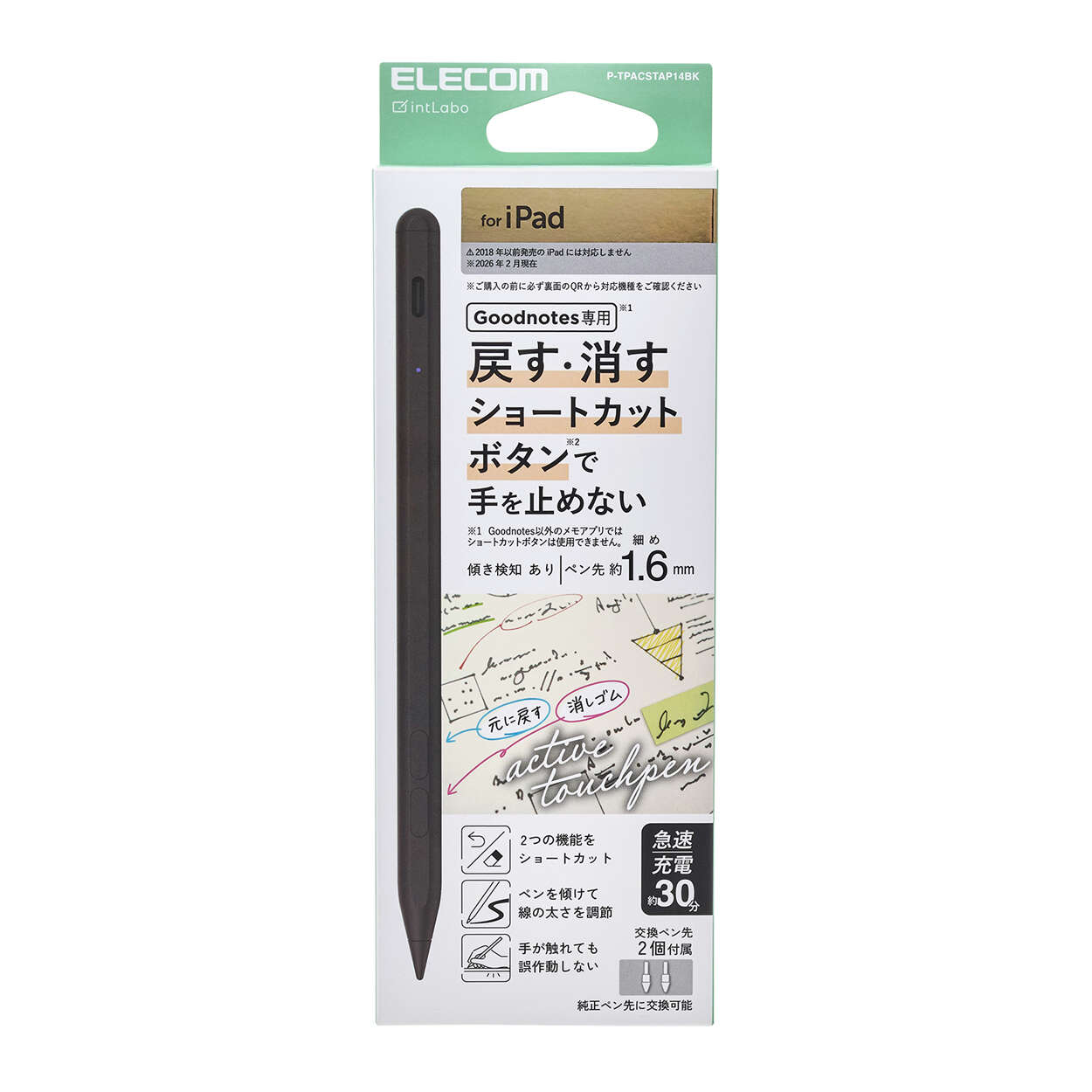 手を止めずスムーズに書ける!Goodnotesアプリでよく使う「戻す」と「消す」を、ショートカットボタンを押すだけで使えるiPad用アクティブタッチペンです。約30分でフル充電可能な急速充電機能を搭載。ペン先は、Apple Pencil (第1世代)、(第2世代)、(USB-C)、(Pro)と交換が可能で、お好みの書き味に合わせて替えることができます。