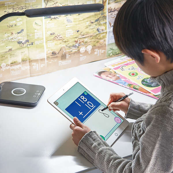 鉛筆と同じように親指、人差し指、中指の3点で軸を捉えられる、持ちやすい子ども向け鉛筆型タッチペンです。軽い力で滑らかな操作を叶える高密度ファイバーチップを採用しています。