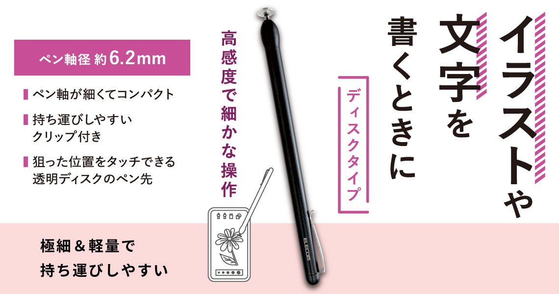 イラストや文字が書きやすい!極細・軽量でスリムに持ち運べ、サッと取り出せるタッチペンです。透明なペン先で狙った位置を確認しながら、細かな操作も快適に行えます。
